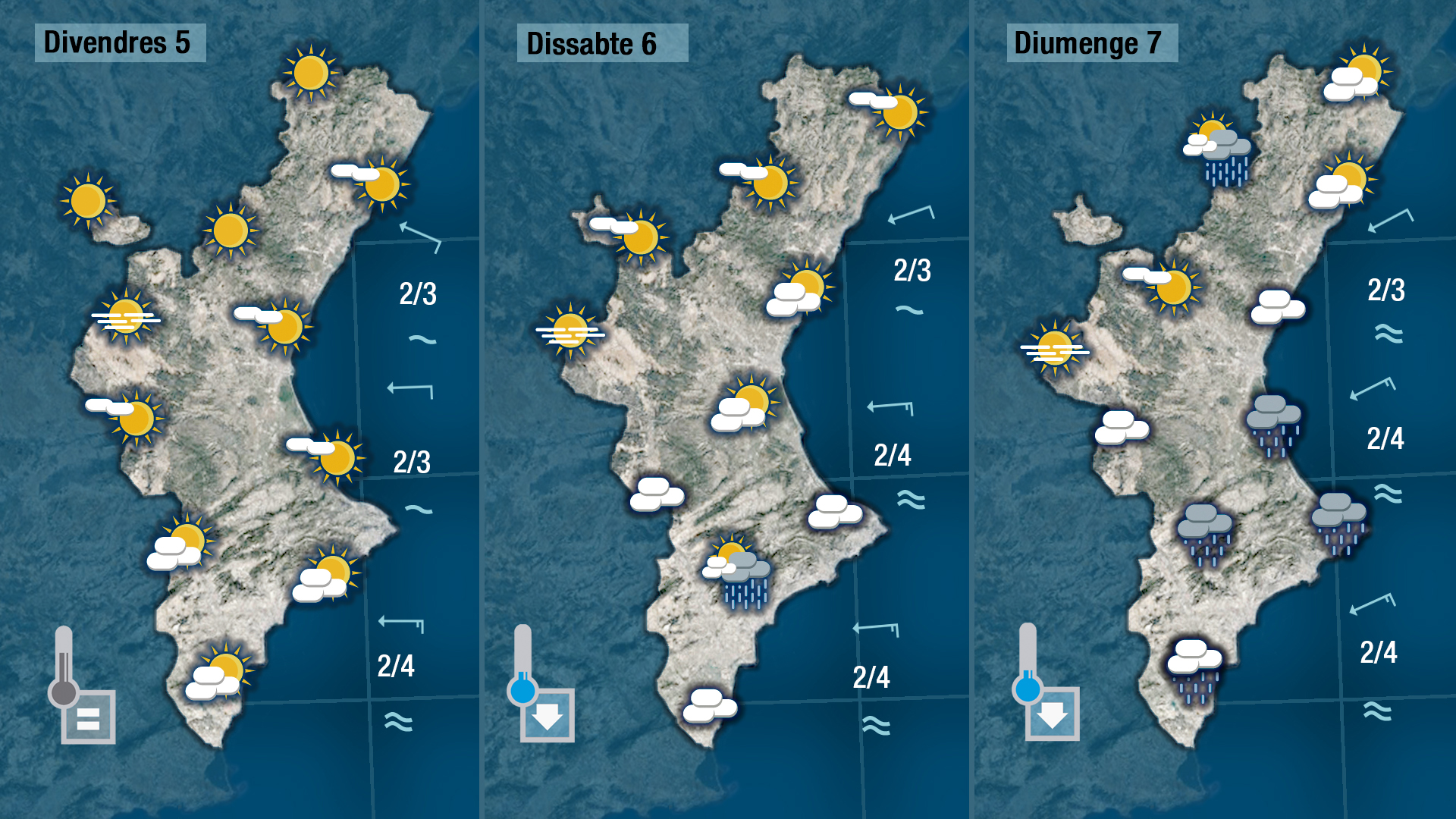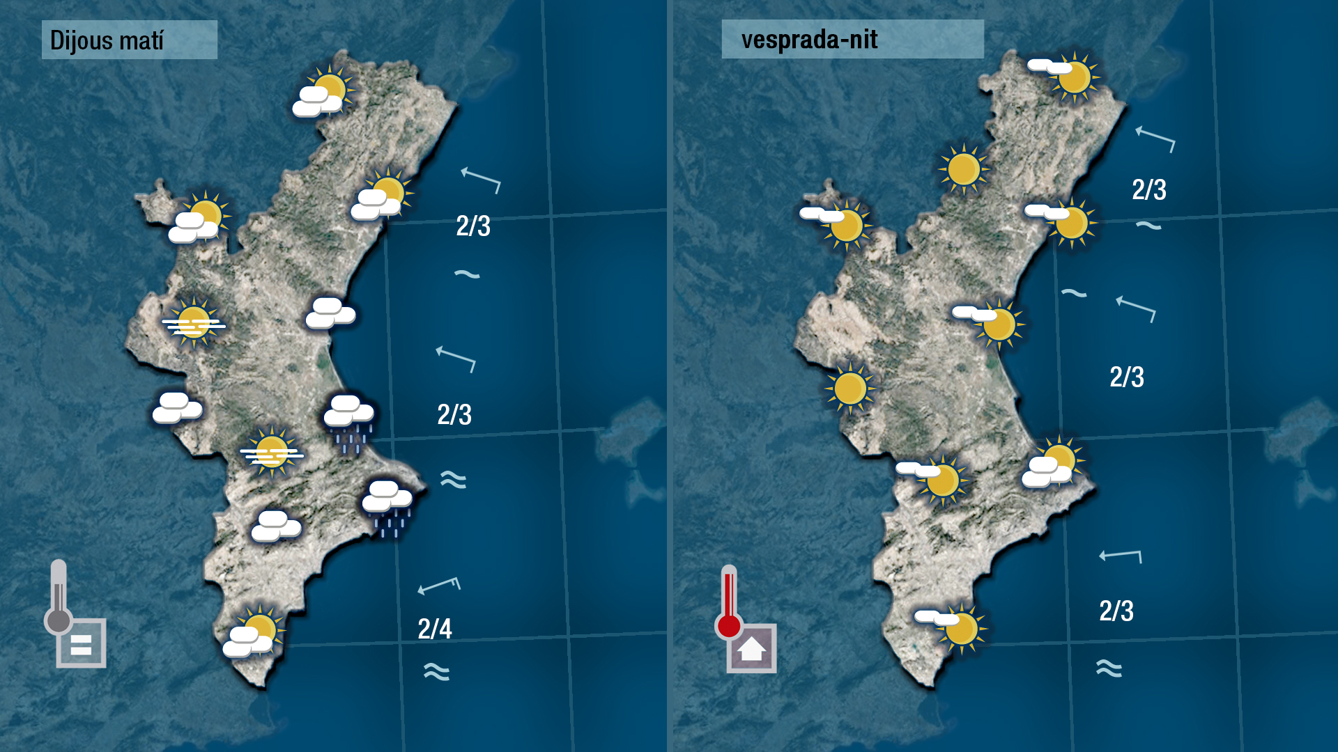 Demà dijous caldrà esperar de nou a migdia peruqè es desfacen els núvols baixos que fins eixe moment seran abundants a la costa del centre i del sud on podrien deixar algun ruixat dèbil. De vesprada farà més sol i pujaran encara un poc més les temperatures.