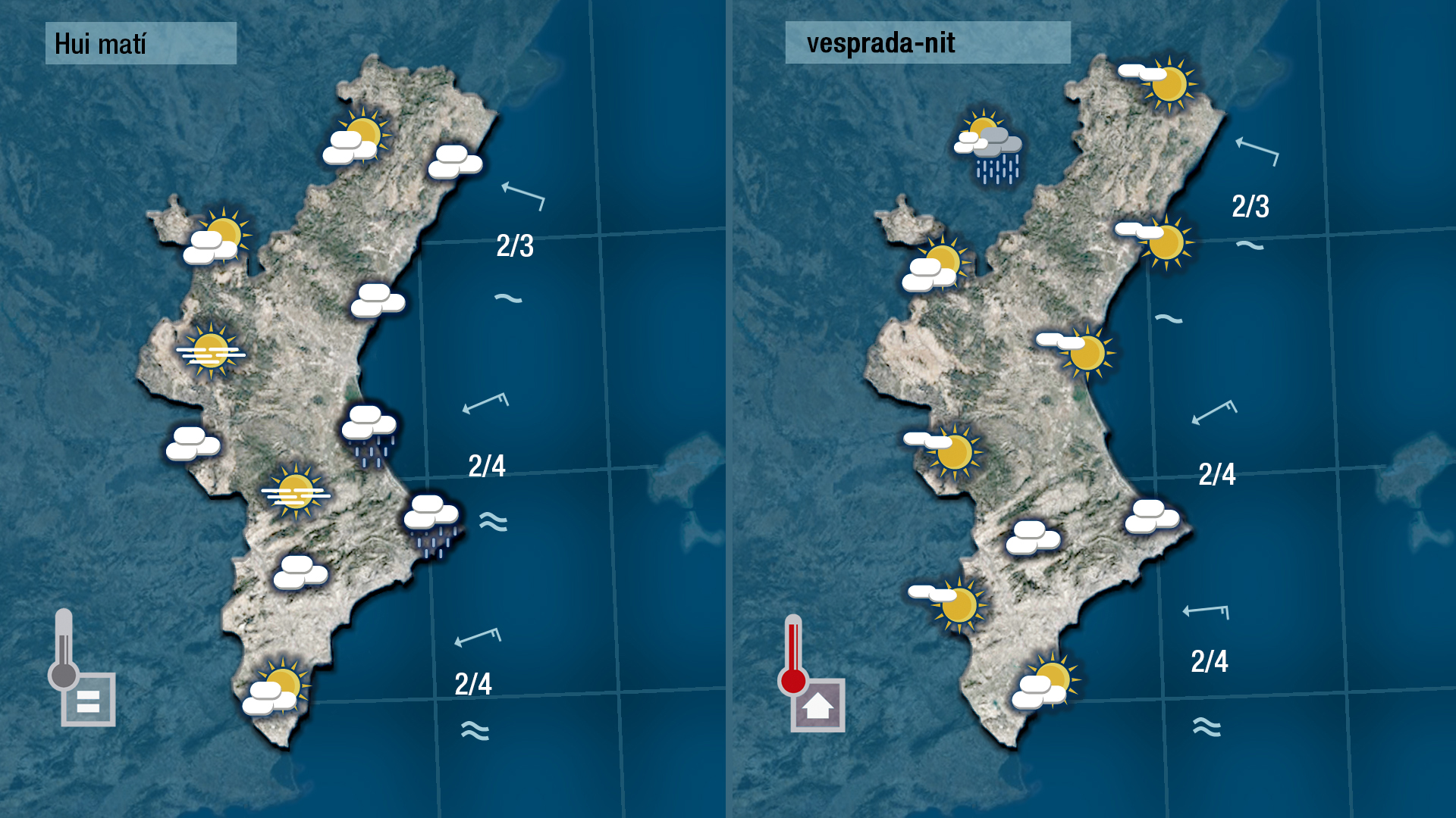 Hui encara ens espera un matí gris, plujós, fresc i amb algun ruixat despistat en punts del sud de València i del nord d’Alacant, però pense que començarem a tindre notícies del sol a mig matí o cap a migdia al nord i en punts de l’interior.