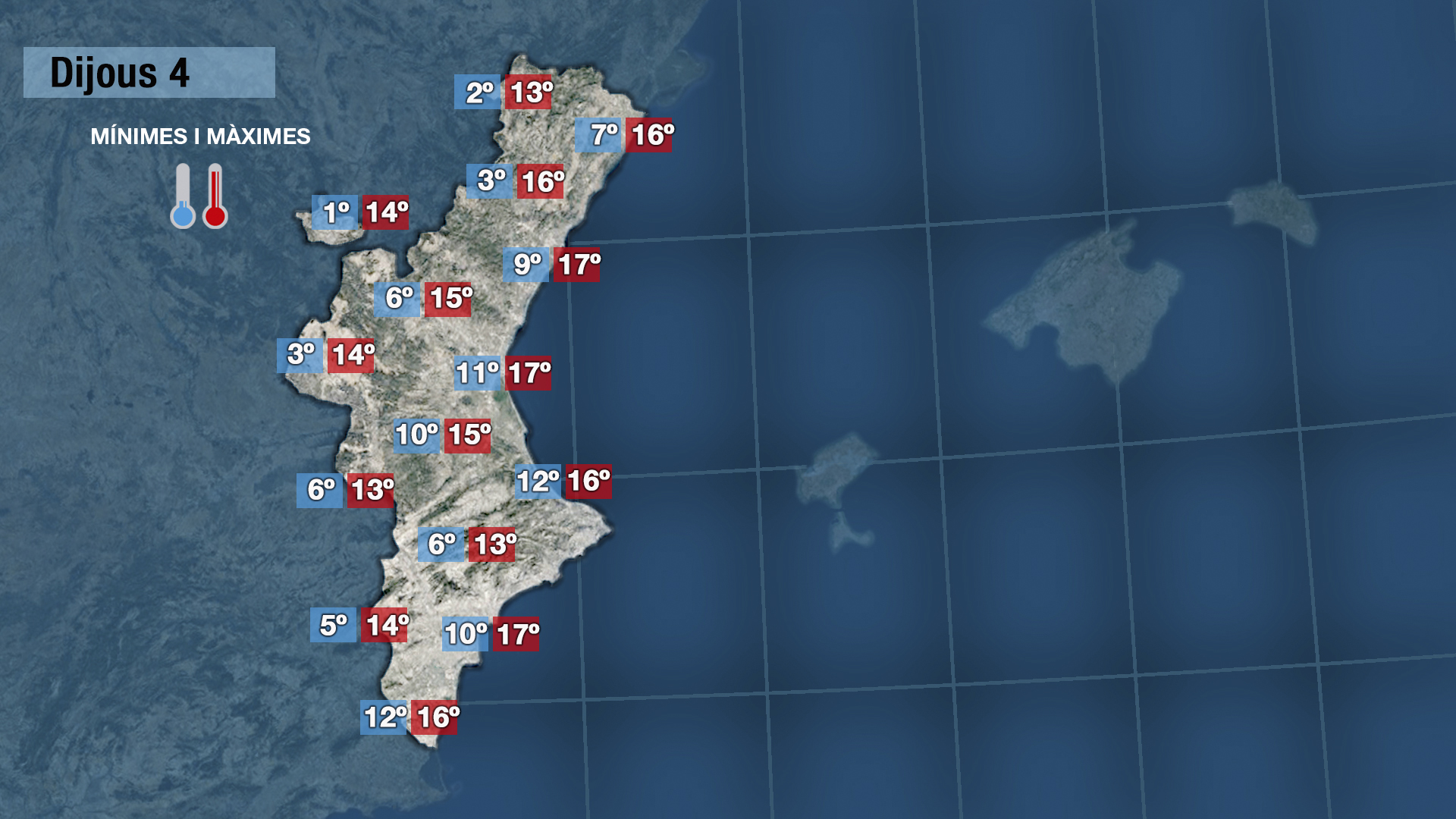 La nuvolositat anirà a menys amb el pas de les hores, però esta vesprada començarem a tindre notícies de la primavera amb el creixement de núvols a les muntanyes del nord amb certa activitat convectiva ( fins i tot podria arribar a quallar alguna tronada). Les temperatures nocturnes s’han many¡tigut sense canvis o han baixat lleugerament i les màximes pujaran u poc.