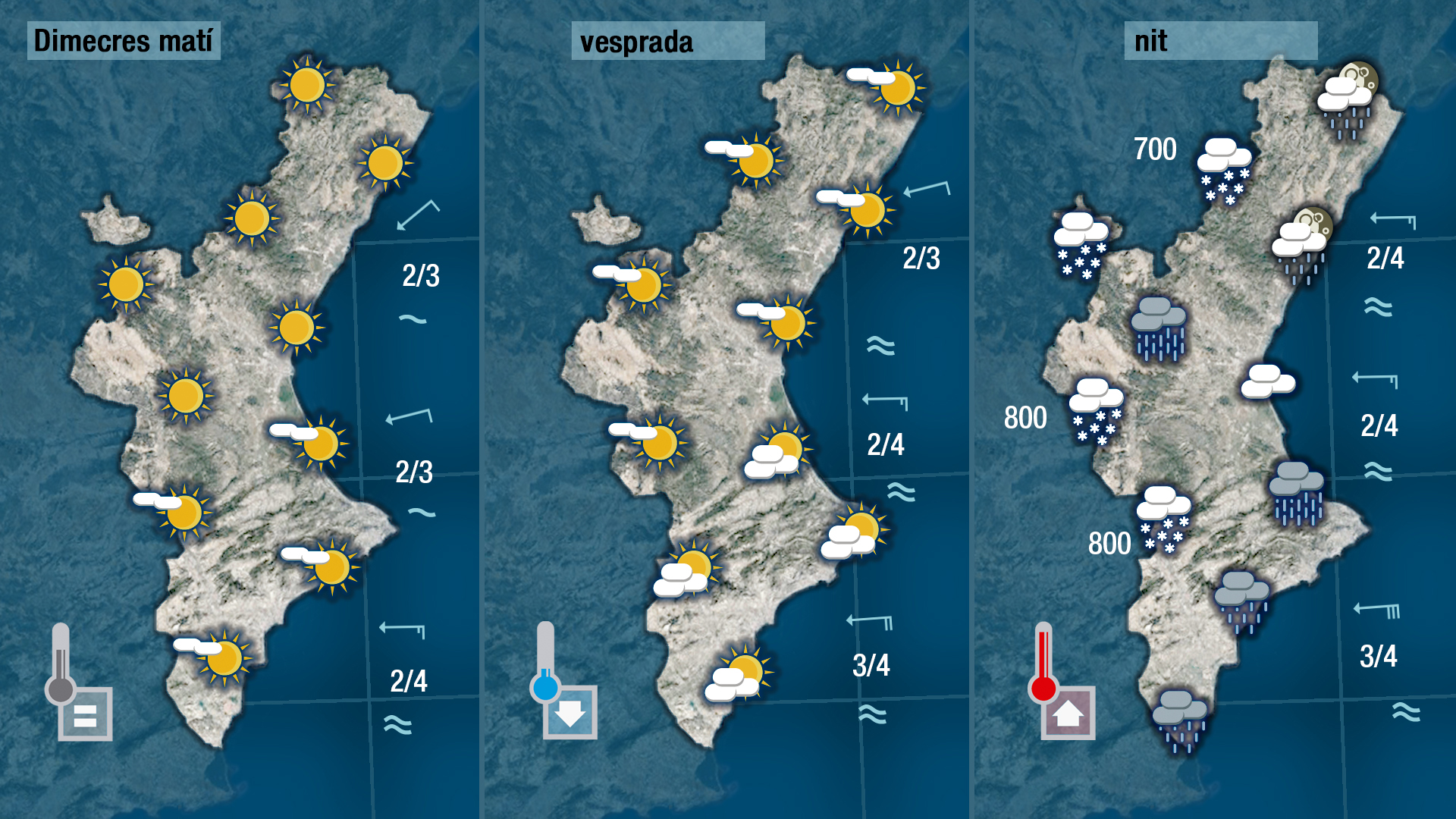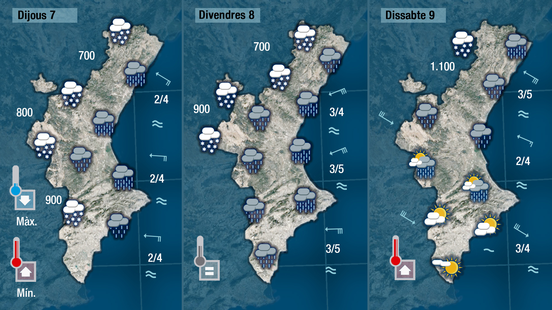 La inestabilitat i la pluja avançaran des del sud i en trobar l’ambient molt fred deixaran neu entre els 600 i els 800 metres. Per la nit es reforçarà el llevant aportant humitat i afavorint qu eles pluges siguen més generals i quantioses.