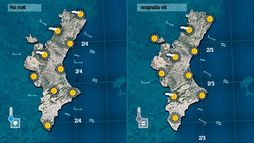 Hui encara es deixarà sentir. Durant el matí bufarà encara amb raxtes moderades però aniraà perdent força fins quedar encalmat (fins i tot piodrà deixar pas a les brises en punts de la costa a partir de migdia). Les mínimes han baixat esta nit i les màximes no patiran canvis.