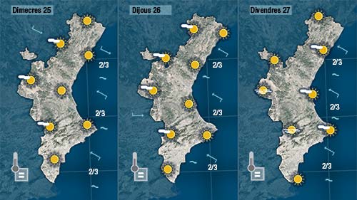La nit de Nadal i el dia de Nadal encara encalmarà més el vent. Al nord encara bufarà fluix de mestral però a la resta del territori oense que serà el xaloc qui predomine deixant les temperatures més baixes a la costa.