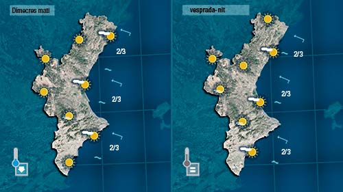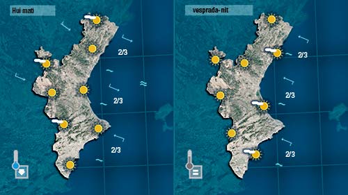 Demà dimecres també començarem el dia amb ambient fresc. Les temperatures començaran a repuntar quan calfe el sol i desfaça les boires que puguen formar-se a les zones més fondes i els núvols baixos que puguen hi haure a primera hora a la franja costera.