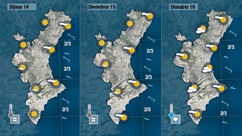 Dijous i divendres tampoc esperem canvis. Pot ser dissabte el cel estiga més carregat, refresque un poc l’ambient i fins i tot puga caure alguna gota però tampoc estem parlant d’eixa situació de pluges generals i generoses que trobem a faltar (també és ben cert que tampoc és època de llevantades).
