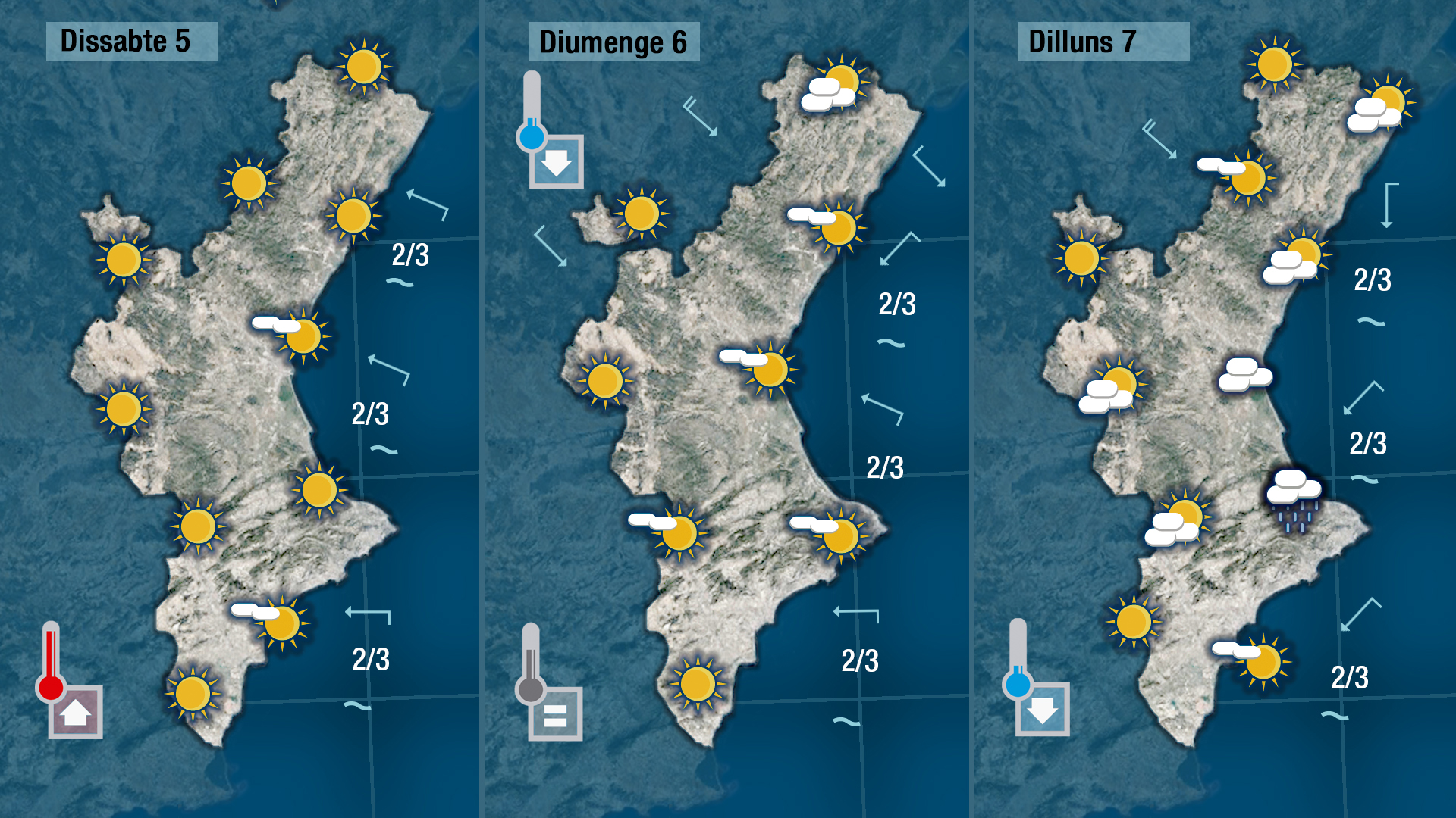 No serà fins diumenge quan comencem a notar alguns canvis. Dissabte tindrem un dia de sol i platja, i d’anar buscant l’ombra al centre del dia, i diumenge també farà calor, però a les acaballes del dia notarem com el vent entra de tramuntana i mestral afavorint un descens de les temperatures.