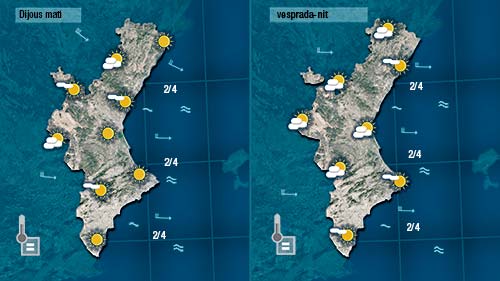 Pocs canvis cal esperar per a demà dijous. Durant el matí lluirà el sol i de vesprada tindrem núvols mitjans i alts que deoxaran el cel més cobert. Les temperatures no patiran grans canvis.