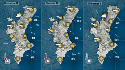 D’ací a diumenge tindrem temps de seguir amb detall els canvis de temps que marquen les previsions d’ací a quatre dies. De moment diumenge els mapes donen mestral, un descens moderat de les temperatures i precipitacions dèbils al nord que podrien ser de neu al voltant dels 1300 metres la matinada de diumenge a dilluns.