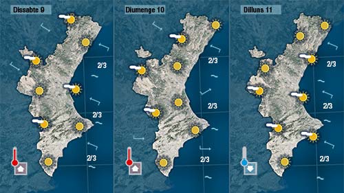 El cap de setmana pre-faller tornaran el sol i la calor. Dissabte pujaran les temperatures lleugerament i diumenge l’ascens serà més marcat en deixar-se sentir de nou el ponent.