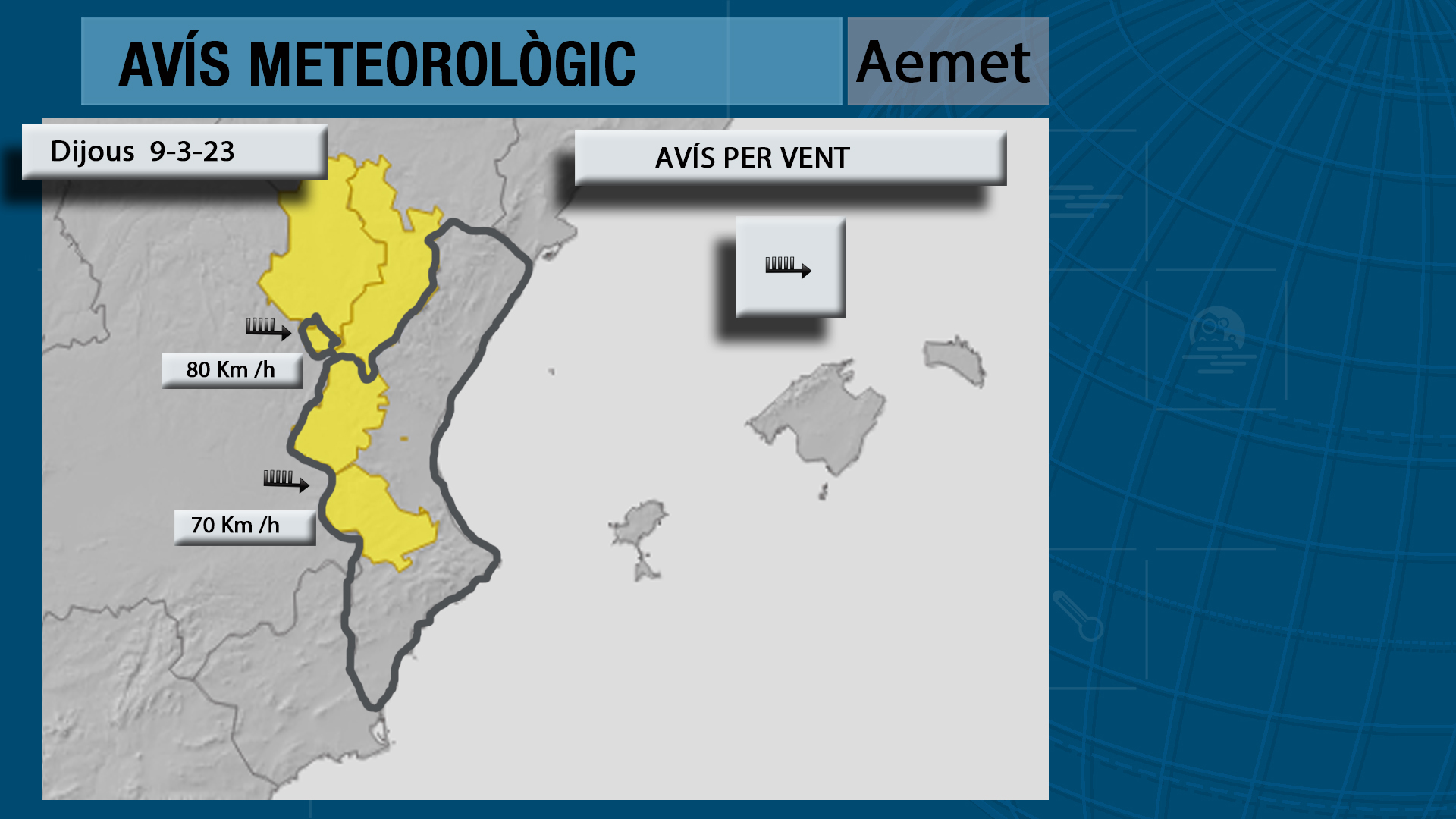 El ponent es deixarà sentir més fort la qual cosa a provocat que Aemet haja donat un avís per vent al centre i a l’interior de València on les ràfegues més fortes podran superar els 70-80 Km/h.
