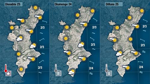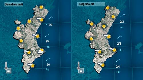 Demà divendres el gregal continuarà deixant la mar alterada al litoral de la mitad sud de la Comunitat però apenes aportarà algun núvols baixos a la franja costanera. Les temperatures no patiran canvis o pujaran un poc.