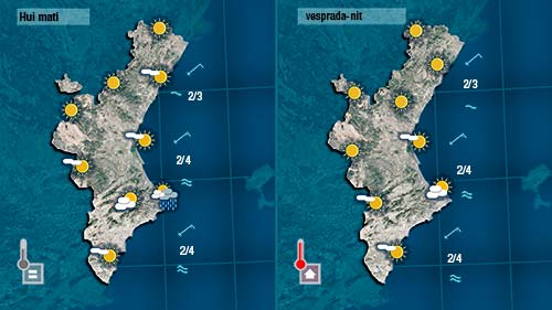 La primavera comença amb poc activitat. Sembla que hui encara podrà registrar-se algun ruixat cap a la Marina o La Safor en començar el dia però amb el pas de les hores es disiparà la nuvolositat i acabarà imposant-se el sol a la major part del territori afavorint un lleuger ascens de les temperatures màximes.