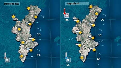 Demà dimecres el vent encalmarà i serà el xaloc qui predomine. Les temperatures pujaran a ponent i baixaran a la costa. Vorem pocs núvols al cel.