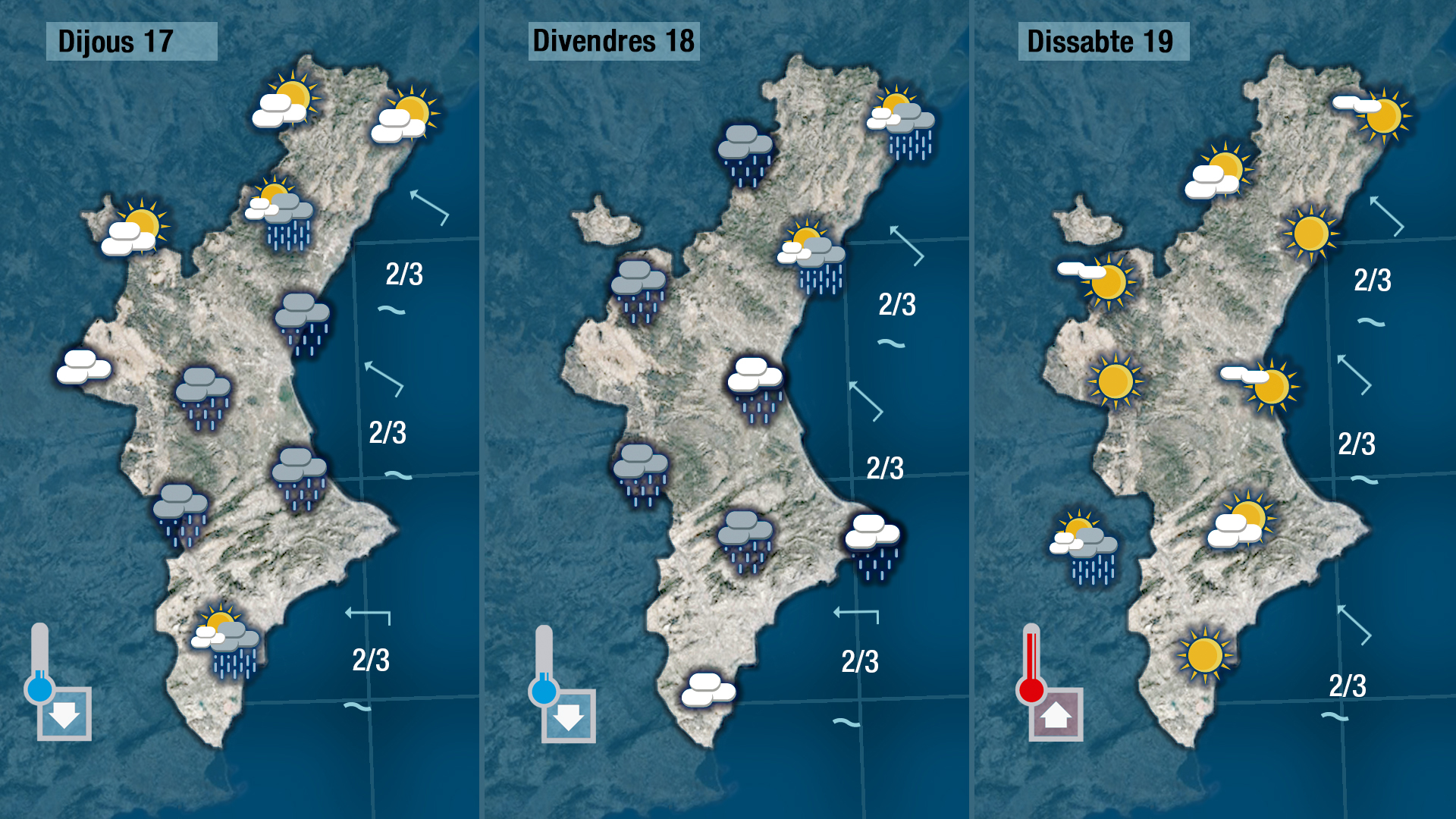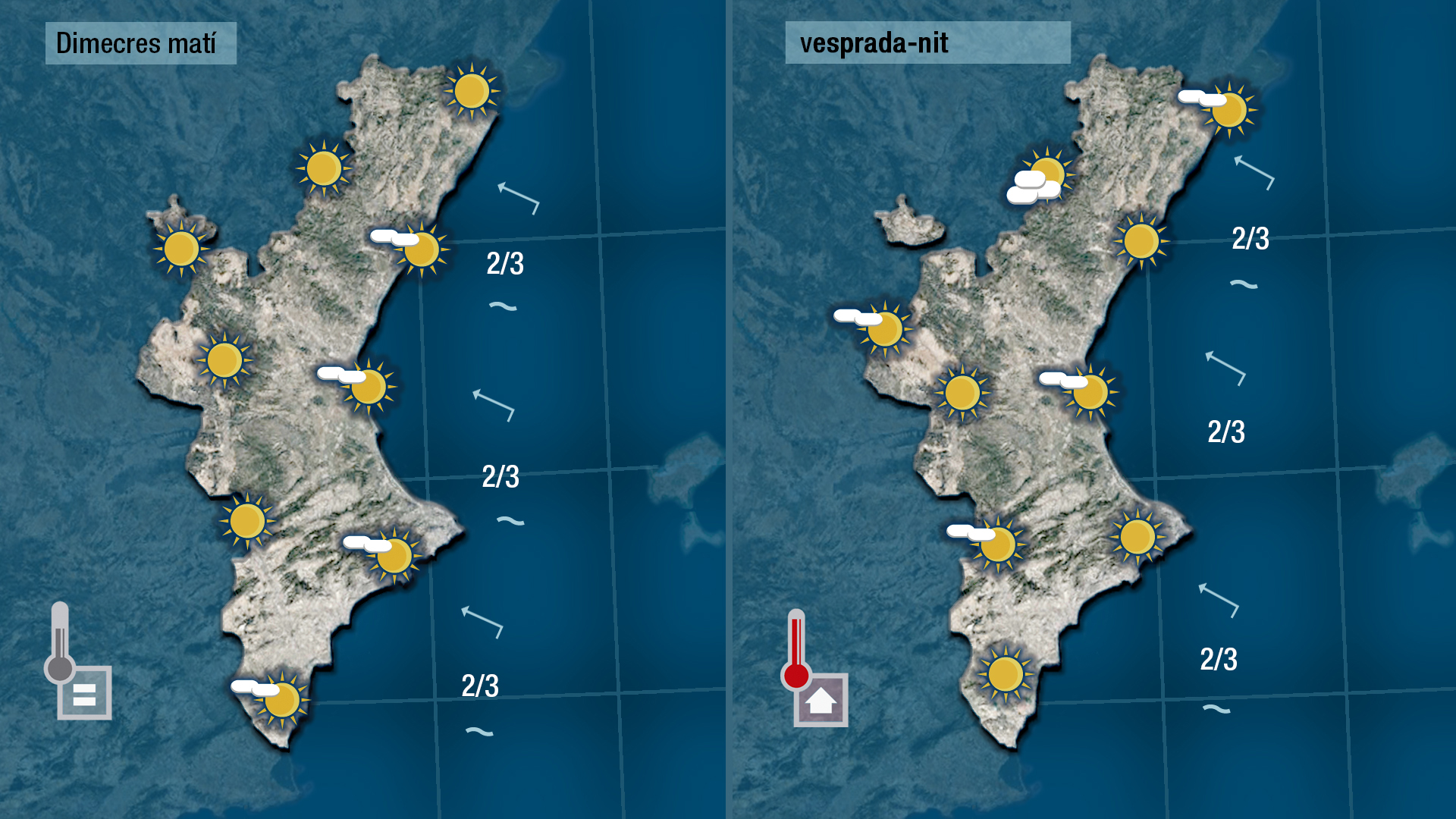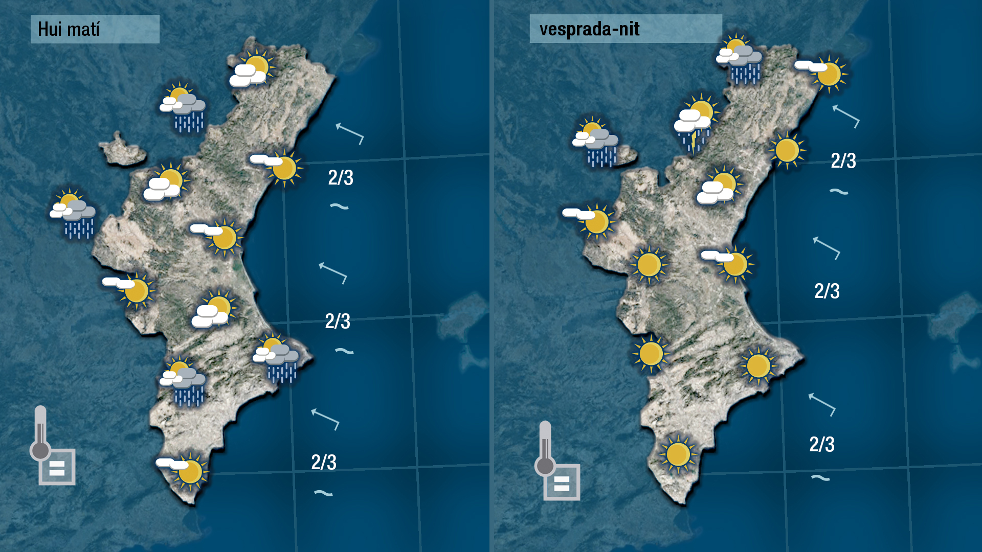 Hui tindrem més núvols que ahir però les temperatures no patiran grans canvis. Durant el matí podem esperar ruixats dèbils, dispersos i esporàdics al nord i interior de Castelló i de València i a la muntanya d’Alacant. A migdia s’obriran clars al temps que creixen núvols d’evolució al nord on de vesprada cal esperar tronades als voltants del Penyagolosa.