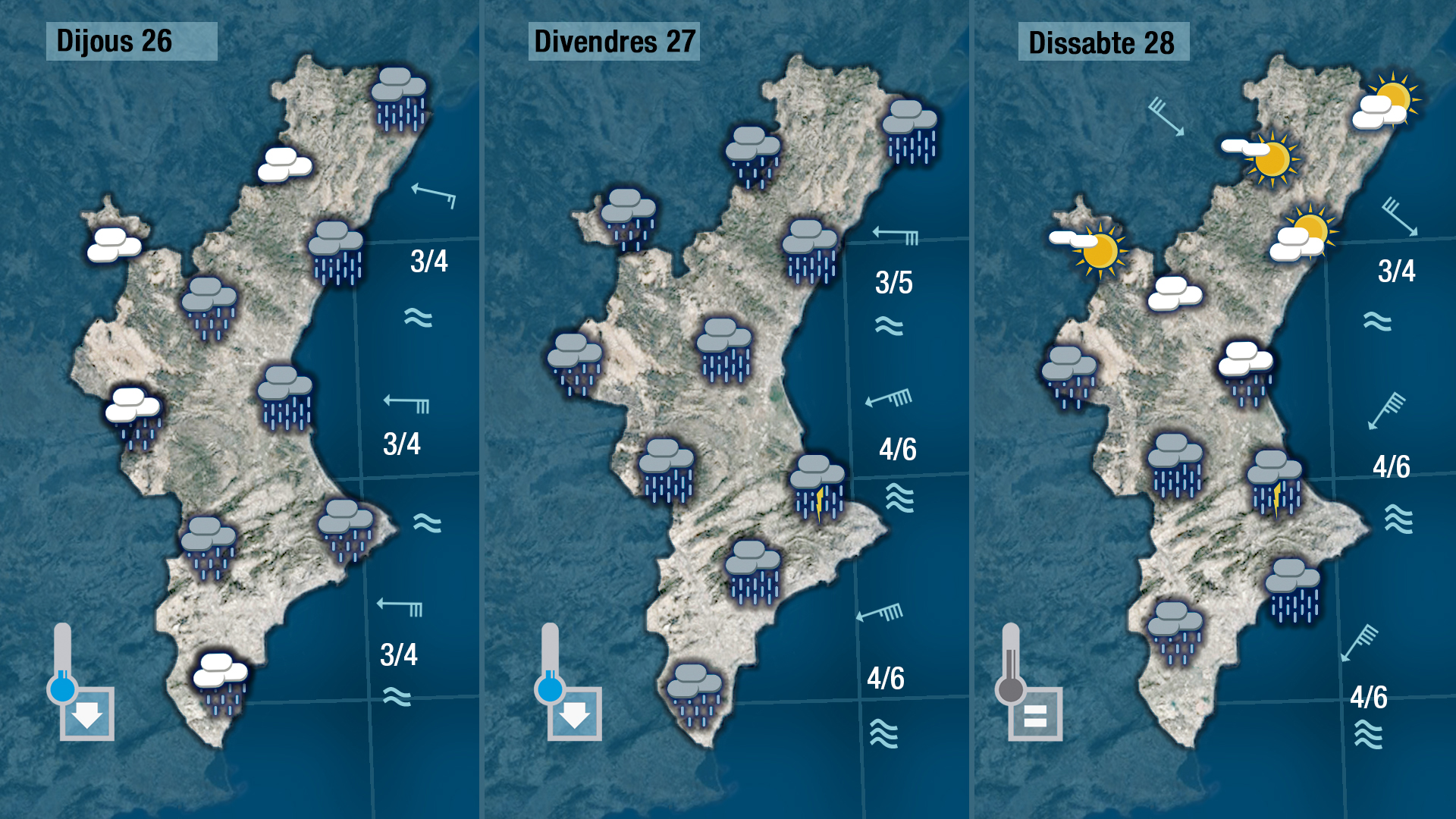 Dijous tindrem el cel tapat de sde primera hora amb ruixats més probables a la mitad nord de la Comunitat i en punts de la costa però en acabar el dia pensem que haurà plogut per tot arreu i que les pluges poden deixar ja quantitats de certa importància.