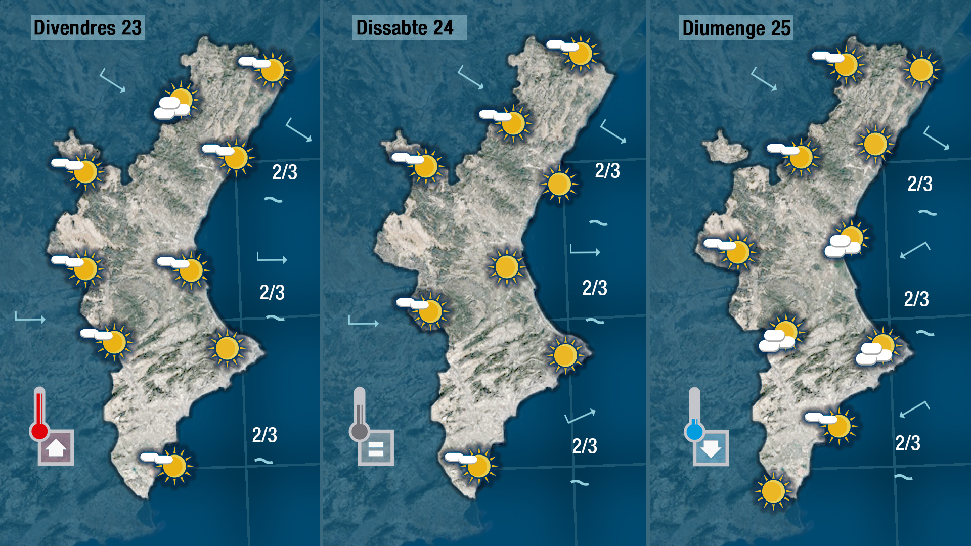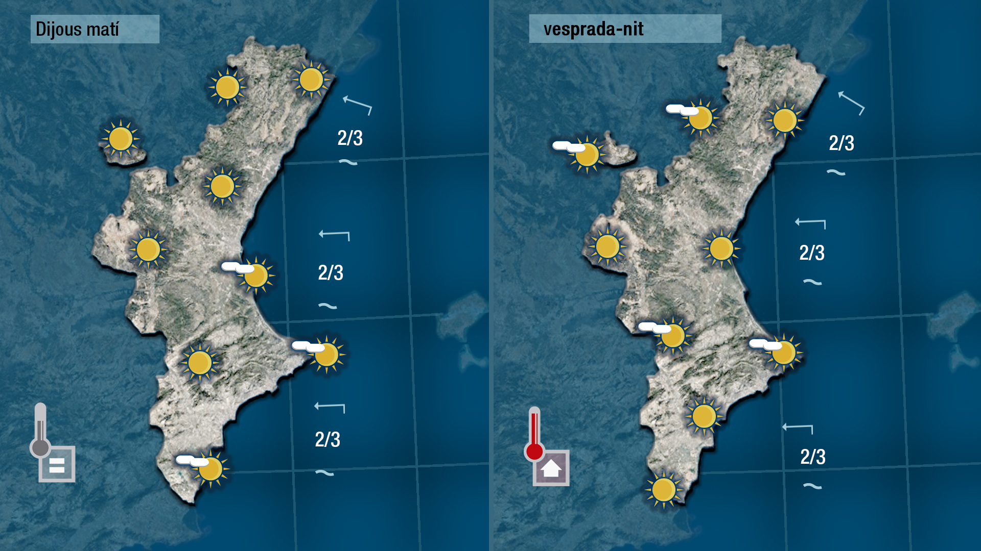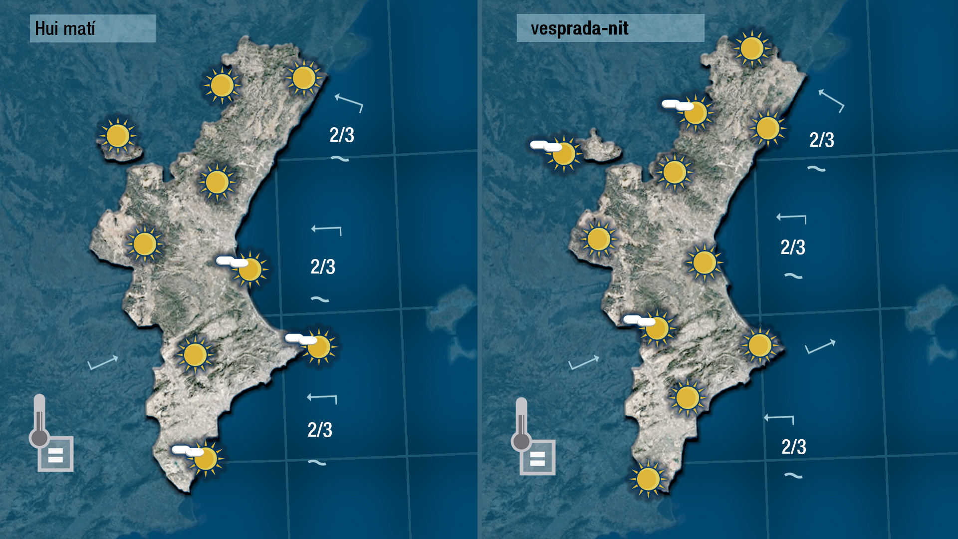 Arribem hui a l’equador de la setmana amb pocs canvis i amb perspectives de més calor per als pròxims dies. Vorem pocs núvols i les temperatures quedaran tan altes com les d’ahir. No han patit massa variació les mínimes i tampoc patiran massa canvis les màximes.