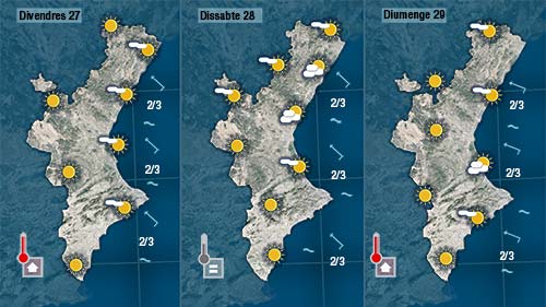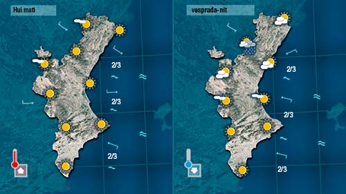 Divendres en fer més sol les temperatures pujaran un parel de graus. Un dia de molta calma, amb vents fluixos de xaloc que poden acumular núvols a la costa a primera i última hora del dia.