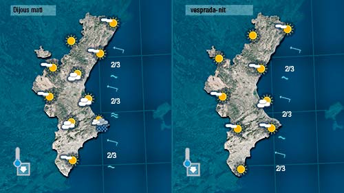 Demà dijous tindrem més núvols i temperatures un poc més baixes. No es descarta algun ruixat dèbil en punts de La Marina o de La Safor en començar el dia però a poc a poc la nuvolositat guanyarà terreny als núvols.