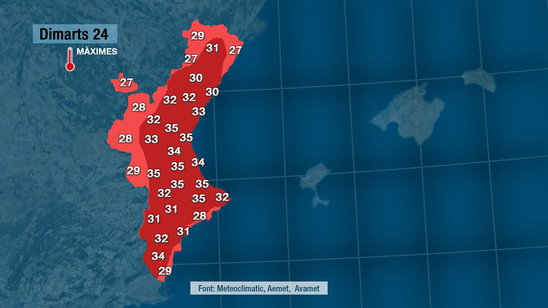 Comencem el dia encara amb ponents i amb temperatures d’estiu a bona part de la Comunitat però a migdia notarem com girarà a gregal ia llevant aportant una massa d’aire més humida i fresca que farà baixar de forma notable les temperatures. A més aportarà núvols que seran més abundants a la mitad nord de la Comunitat on no descartem que puga arribar a caure alguna gota.