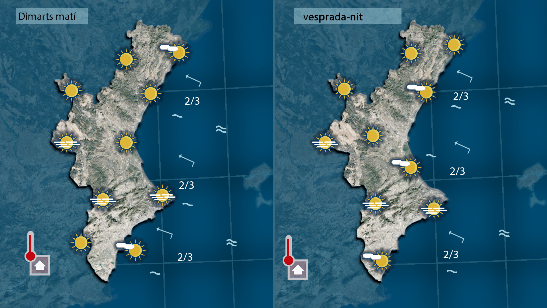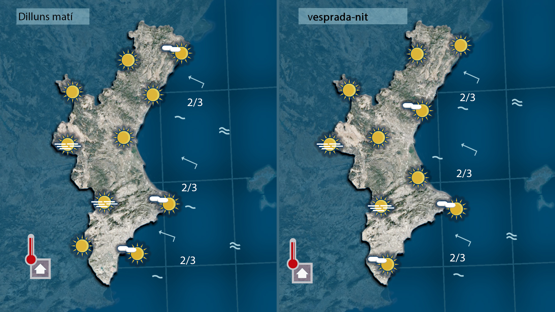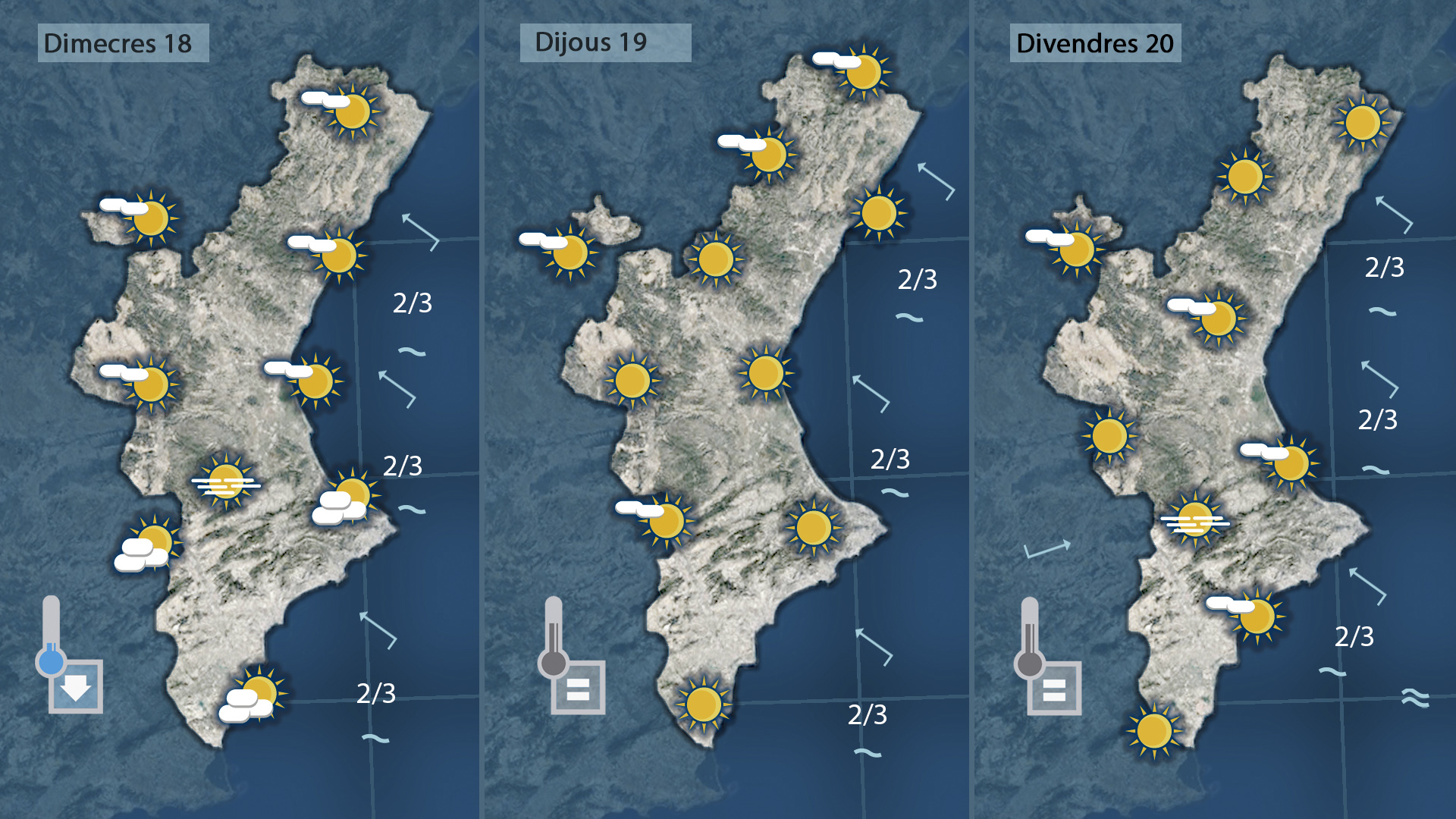 Semà encara pujaran algun grauet més les temperatures. Oratge estable amb lúnic risc que es puguen formar boires d’advecció pel contrast entre la massa d’aire que avança des del nord d’`SAfrica i la mar que es troba més frresqueta i evidentment més humida