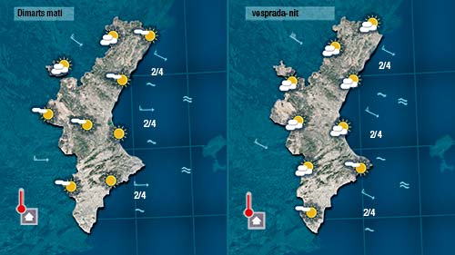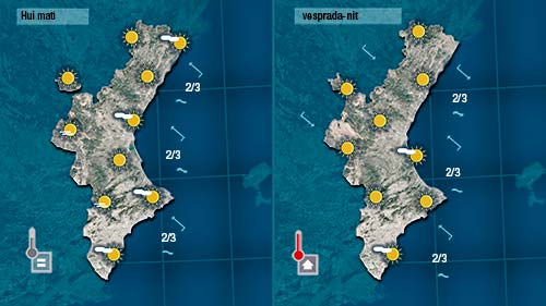 Hui tindrem temperatures com les d’ahir o un poc més altes sobretot al centre i per l’interior on no arriba l’efecte suavitzador del xaloc que es deixa sentir a vora mar. Les boires i els núvols baixos no tardaran en deixar pas al sol.