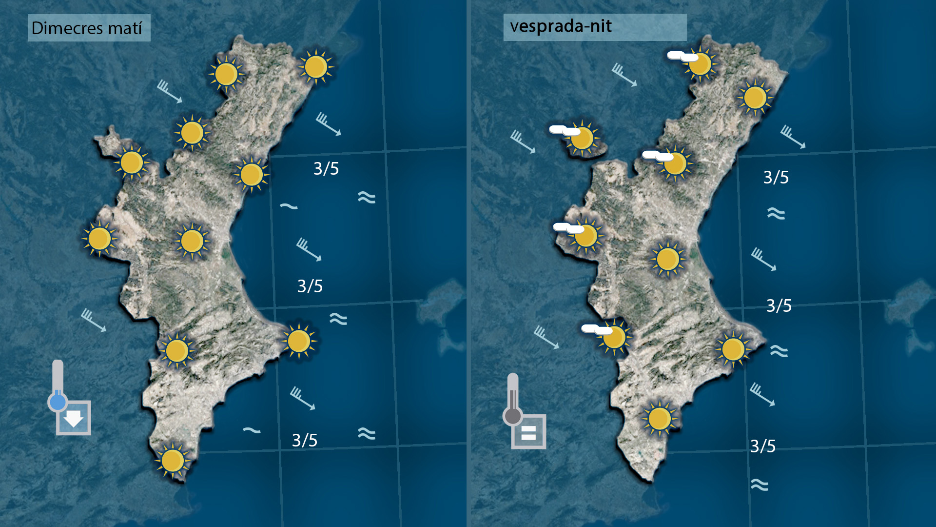 El fred es vorà accentuat pel vent de mestral que es deixarà sentir amb força durant tot el dia. El mestral (o cerç) accentua la sensació de fred però en fer córrer l’aire impedix que les temperatures puguen baixar més del que han baixat esta pasada nit on només a la franja més costanera s’han lliurat del gel