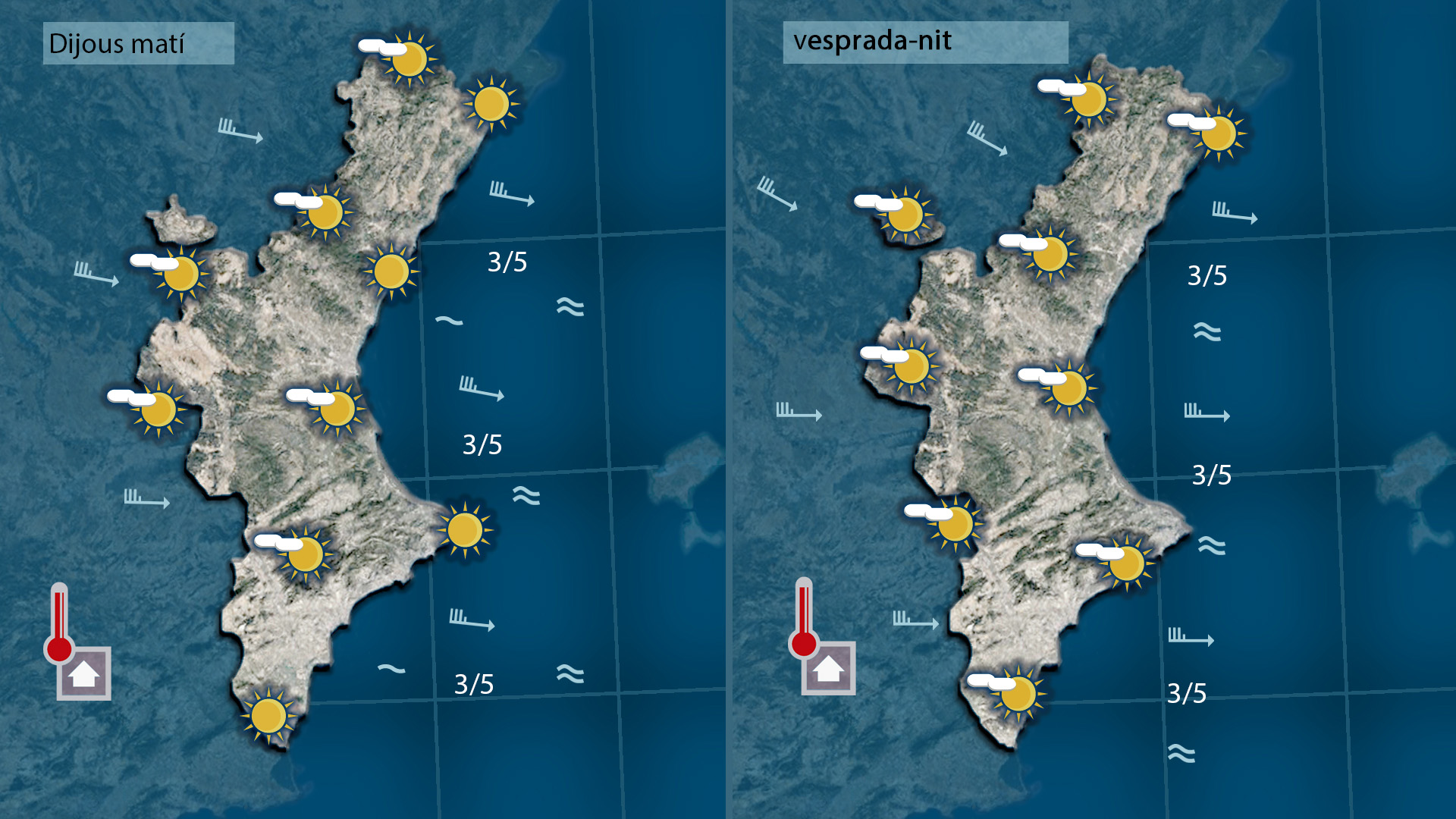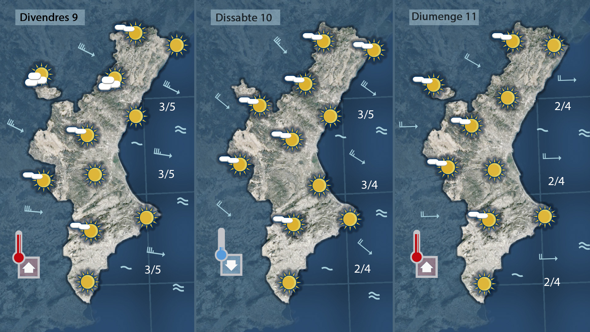 Demà notarem des de primera hora l’ascens tèrmic que vos he comentat abans. Pujaran les temperatures nocturnes desapareixen pràcticament les gelades i les màximes pujaran dels 15 graus a la costa i dels 10 al nord i per l’interior.