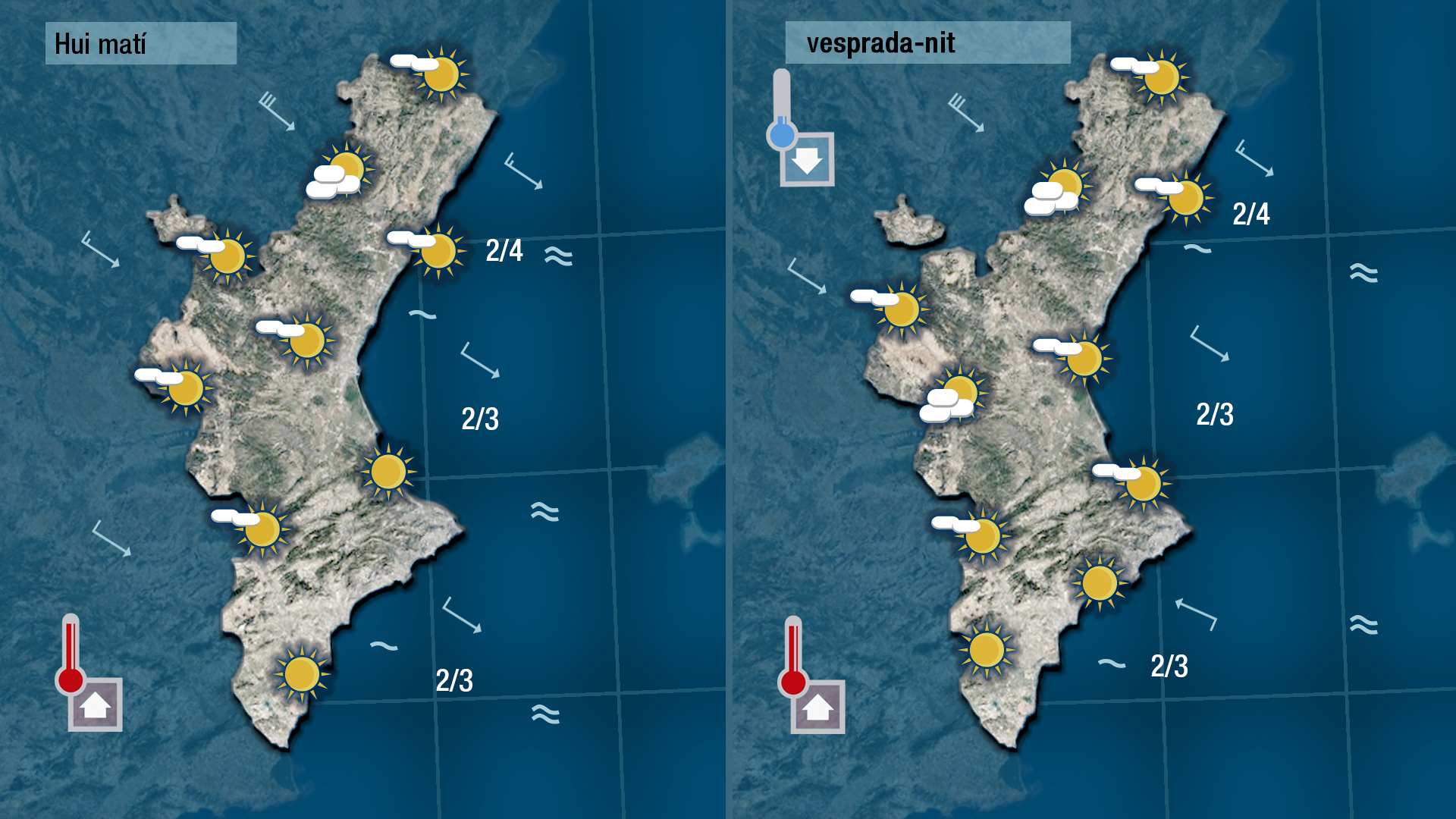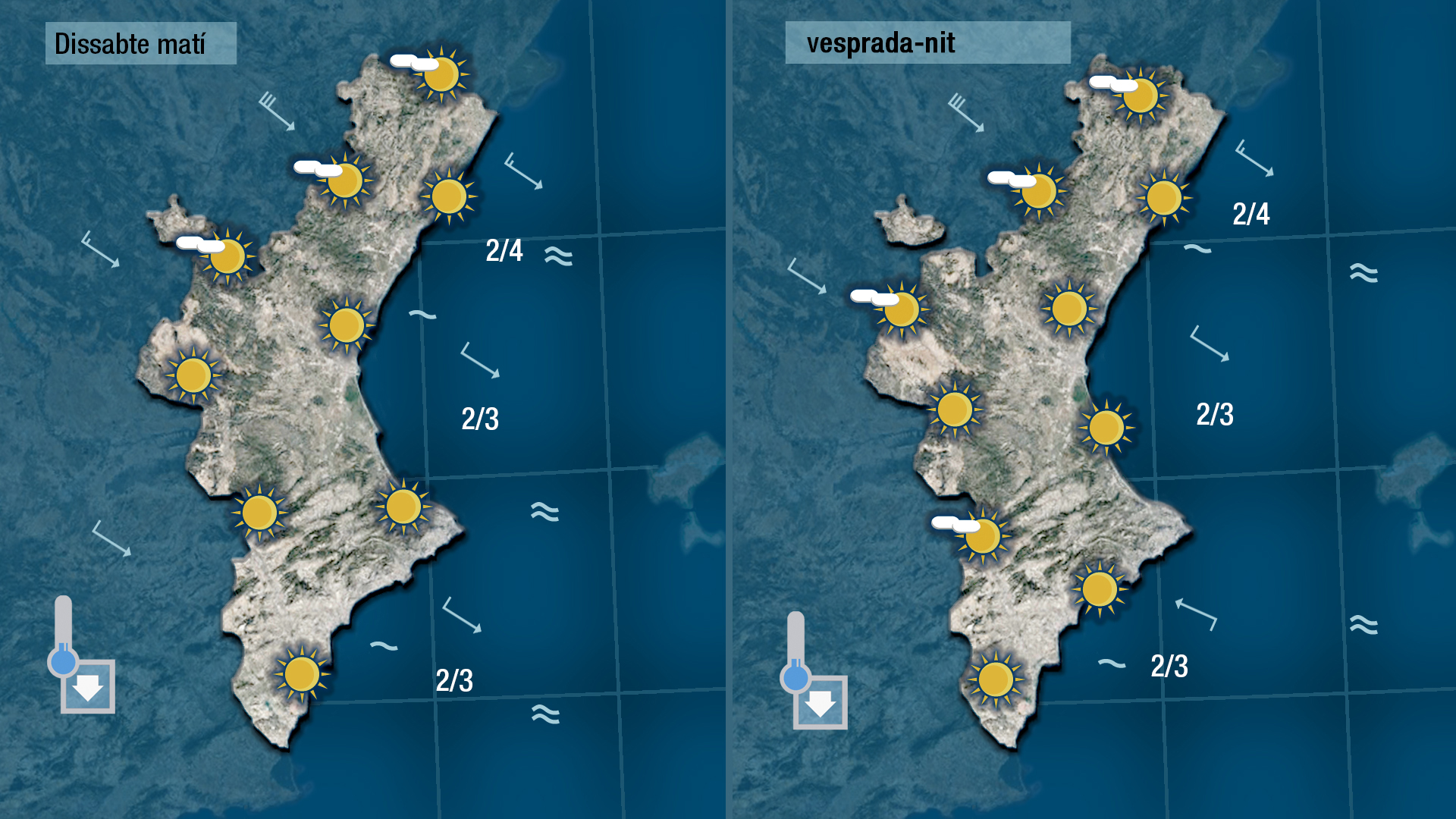 Esta nit han repuntat un poc més però encara ha fer bona cosa de fred, i al centre del dia pujaran a la mitad sud de la Comunitat però al nord, on el mestral bifarà prou fortet, tendiran a baixar.