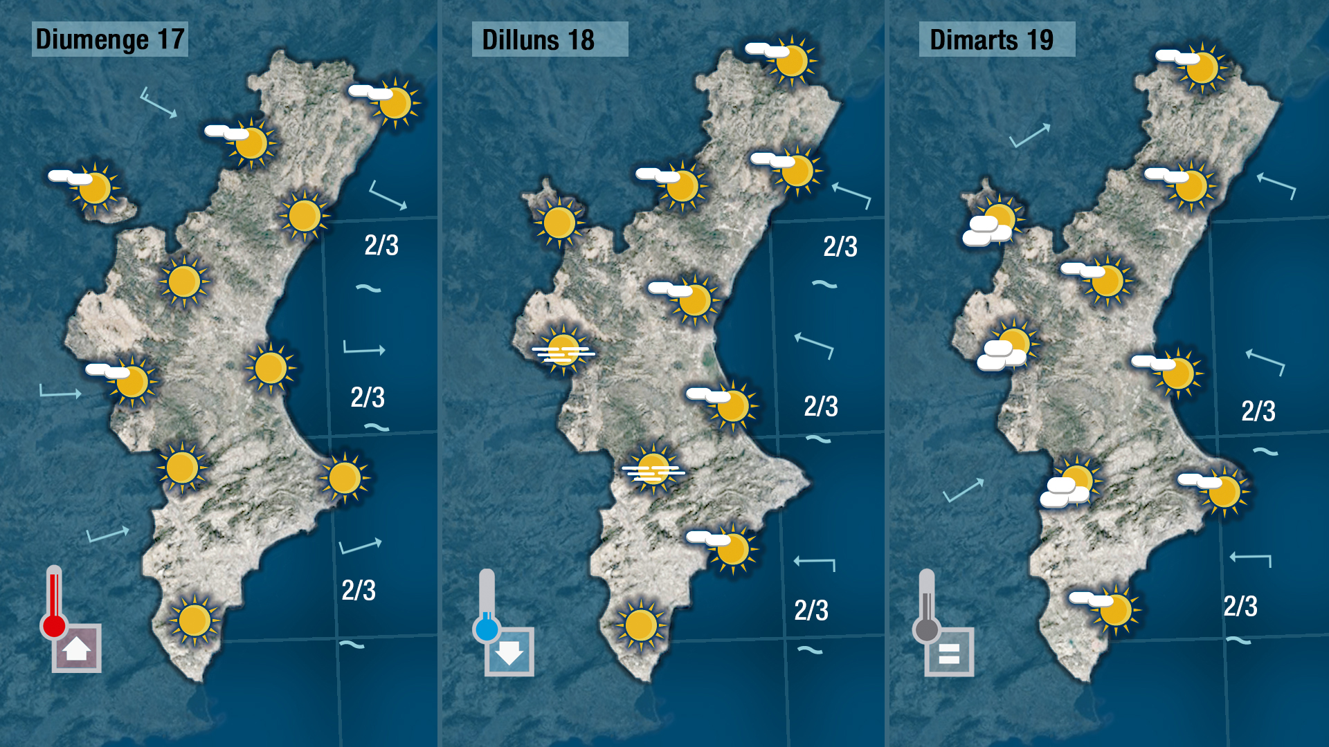 Diumenge en bufar ponent pujaran les temperatures aprop dels 20 graus en punts de la costa i a les comarques més centrals. Les gelades no seran tant intenses i afectaran només les zones més interiors i al centre del dia les temperatures s’enfilaran per fi per damunt dels 10 graus.