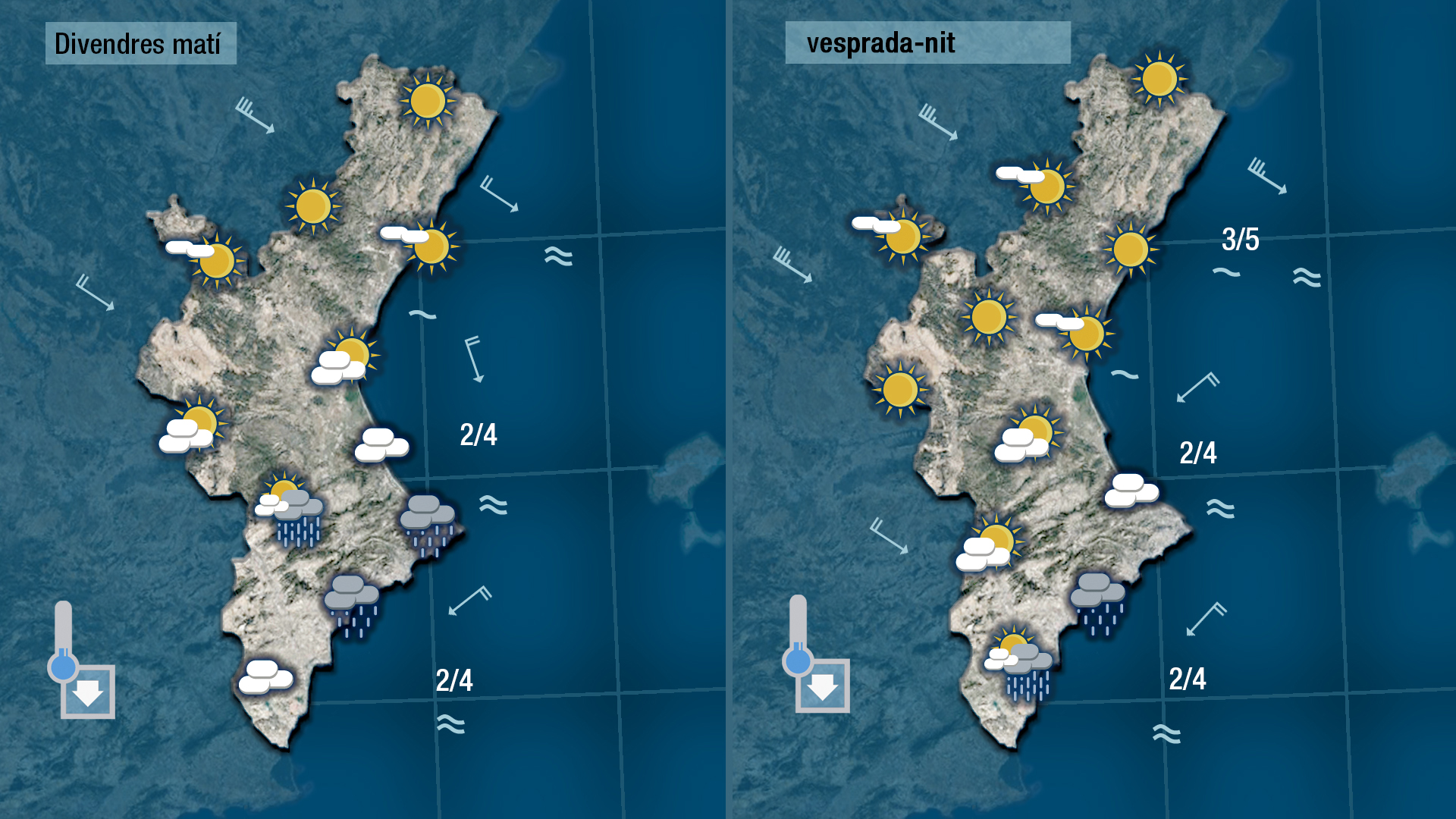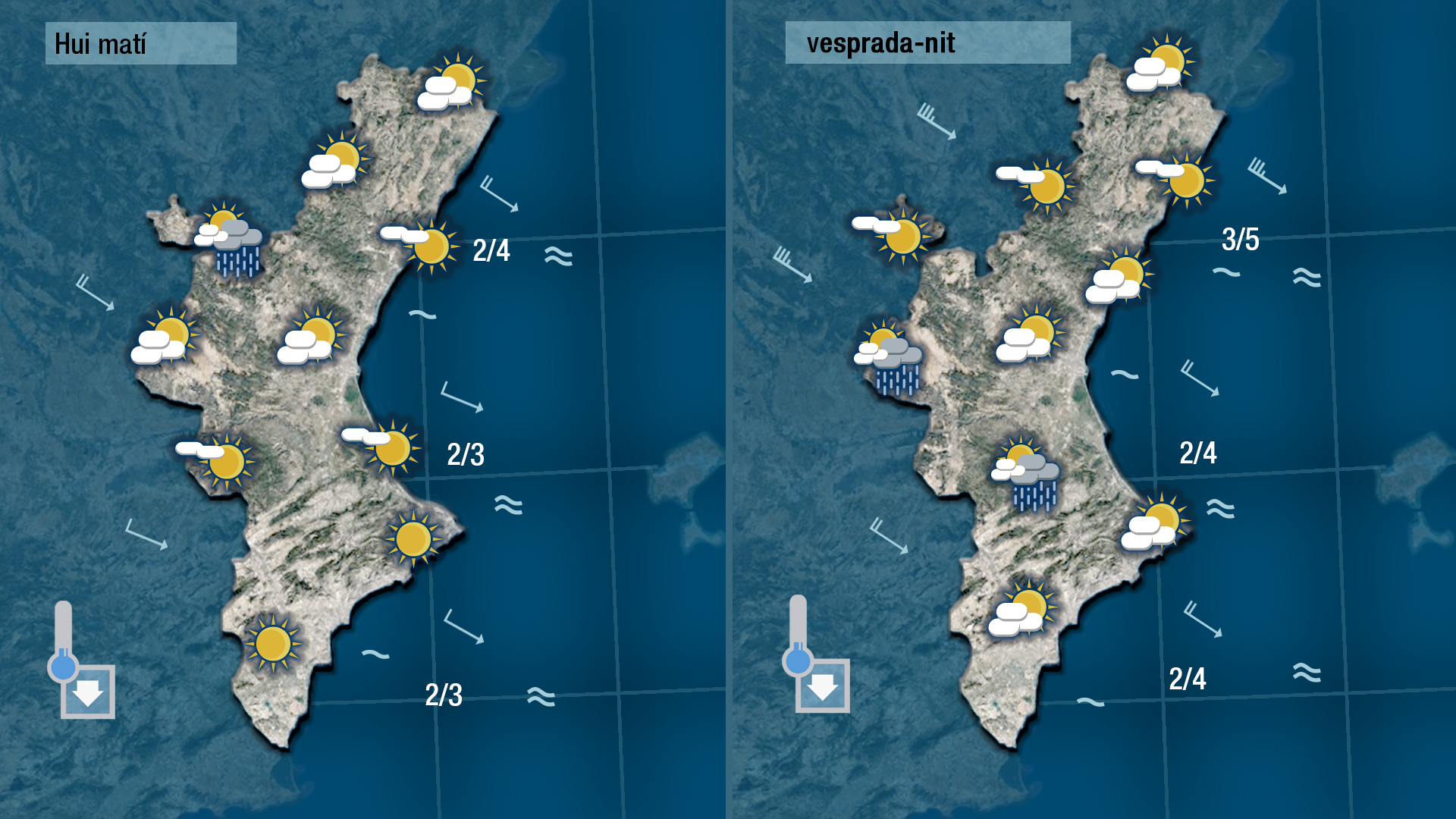 Entrarà hui pel nord de la Comunitat una massa d’aire més freda acompanyant un front que podria deixar les primeres pluges de l’hivern que en qualsevol cas seran de caracter molt dèbil per no dir inapreciables.
