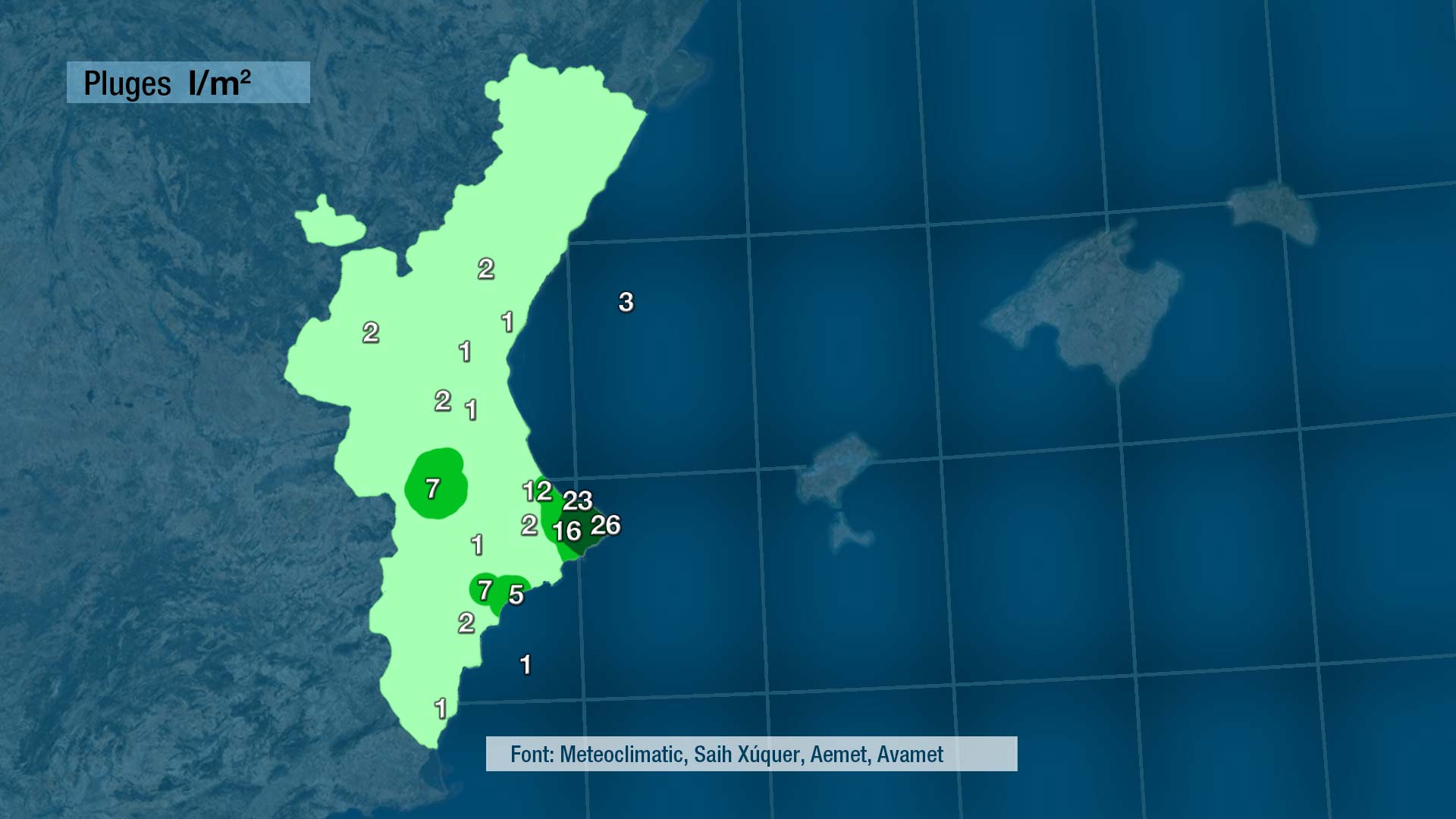 En el següent mapa veiem que el front que ahir va creuar la Comunitat de nord a sud es va passejar sobre la mar i només va deixar algun registre decent a la Marina ia la Safor, però tampoc va ploure de la mateixa forma a tota la comarca.