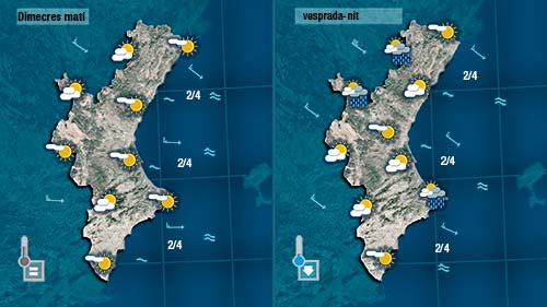 Demà dimecres en girar el vent a mestral notarem de seguida un descens de les temperatures. De vesprada també pot caure alguna gota al nord i a poqueta nit al sud de València i al nord d’Alacant.