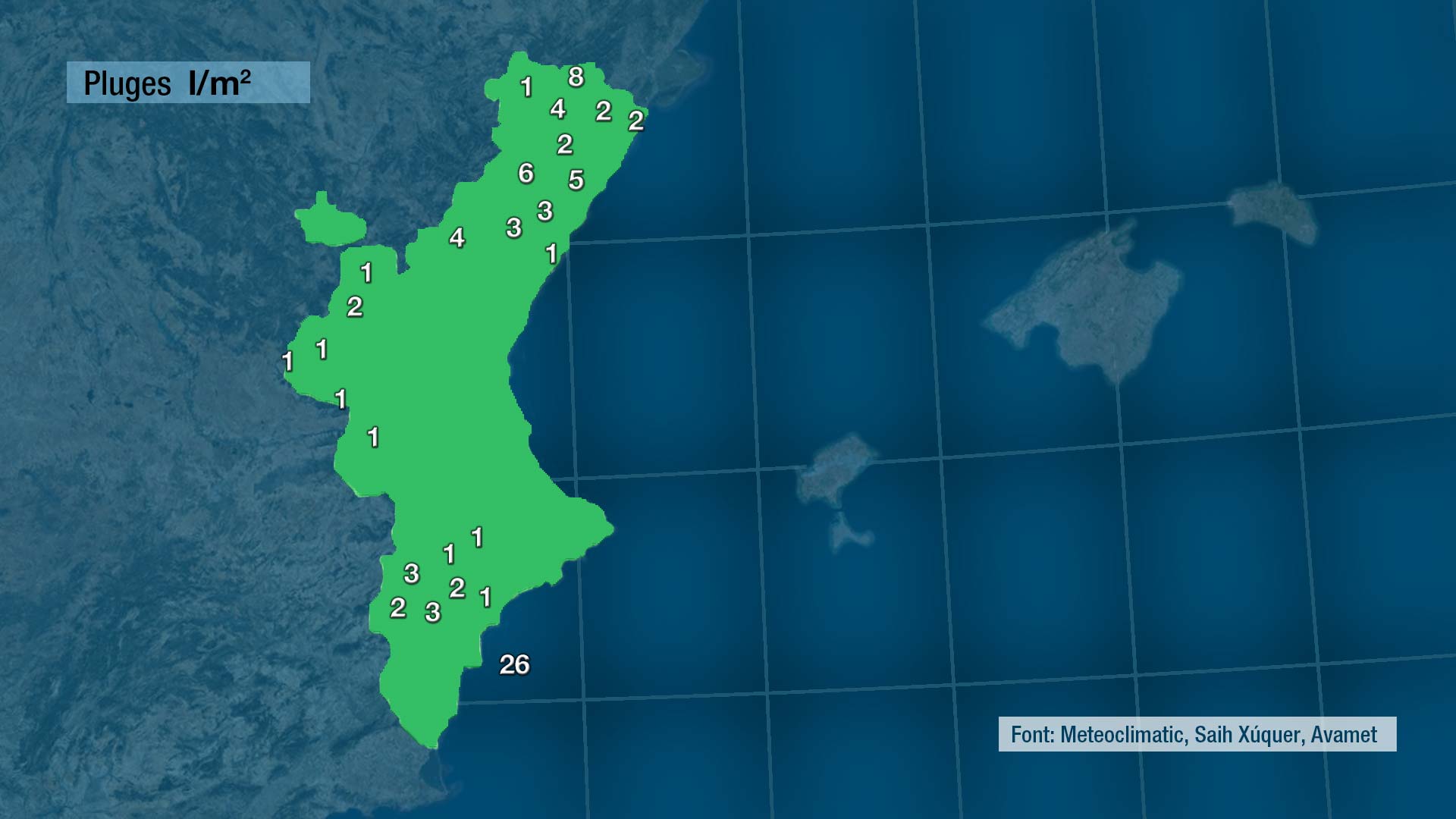 Ahir ens va creuar un que apenes va deixar quatre ruixats dispersos. A pocs observatoris plogué més de cinc litres (destacar els 26 litres que va mesurar l’aobesvartori d’Avamet a l’illa de Tabarca)