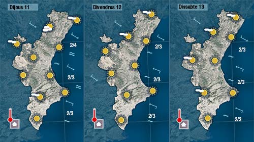 A partir de dijous el vent perdrà força i fins i tot deixarà pas a les brises a vora mar. Al temps notarem un ascens de les temperatures que tindrà continuïtat tant divendres com dissabte.