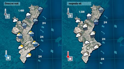 Demà dimecres serà l’ultim dia de temporal. Les pluges seran més dèbils i pensem que afectaran el nord d ela Comunitat on encara podrà registrar-se algun ruixa de certa entitat. La cota de neu quedarà per damunt dels 1.400-1.500 metres.