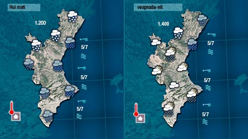 Torna a estar previst que la pluja siga general i que en algun punt descarregue amb intensitat moderada o forta, i fins i tot en forma de tempesta. La mar continuarà amb ones d’entre 4 i 6 metres als litorals de València i al de Castelló. A Alacant també estarà alterada però sembla que no tant.