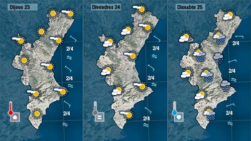 Dijous i divendres tindrem temps de fer balanç perquè l’oratge ens regalarà un parell de dies post-temporal de sol i de temperatures un poc més altes, prquè encara que dissabte els models tornen a donar algo de pluja no tindrà res a vore amb la d’estos dies.