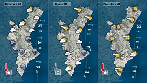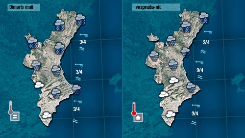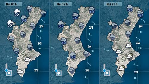 Dimecres encara cal esperar pluges a la mitad sud de la Comunitat mentre que al nord i amb el pas de les horres deixarà de ploure i fins i tot s’imposarà el sol.