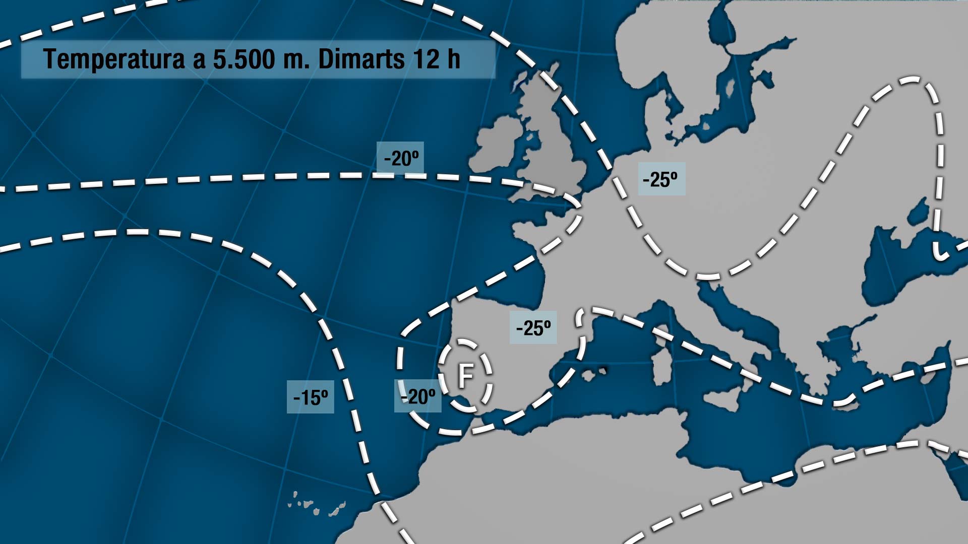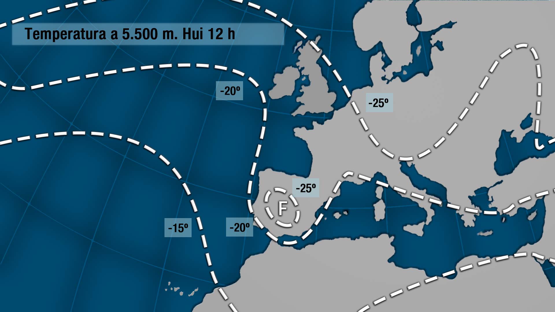 Ahir es despenjava des del nord un embossament d’aire fred a les capes altes de l’atmosfera que hui acabarà al centre de la Península inestabilitzant l’atmosfera i donant pluges generals per tot arreu. En principi les zones més afcetades seran les de la mitad nord de la Comunitat on els acumulats de pluja podran superar els 100 litres.