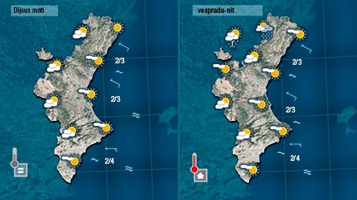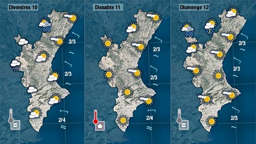 El cap de setmana tindrem núvols però també podrem vore el sol i les temperatures pujaran lleugerament. Només caldrà estar atents a les tronades que diumenge de vesprada podrana fectar les muntanyes del nord.