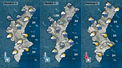 Divendes començarem el dia amb sol però l’acabarem amb el cel prou ennuvolat i amb precipitacions al nord i per l’interior que anunciaran un dissabte gris, plujós, fred i fins i tot amb neu a les muntanyes del nord al voltant dels 1.200 metres. Diumenge encara tindrem pas de núvols que al nord i per l’interior deixaran ruixats dèbils, però sembla que tindrem més sol al sud i les temperatures es recuperaran de la baixada de dissabte.
