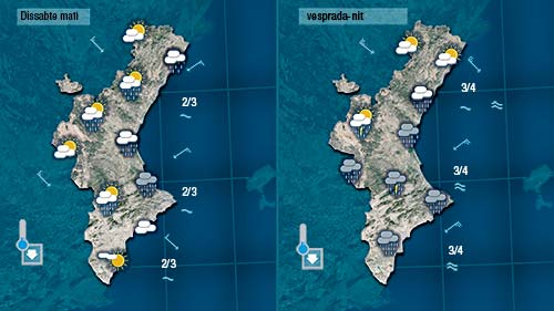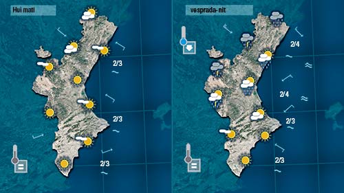 Pensem que les pluges més intenses es registraran durant el matí a la costa i avançaran de nord d sud de la Comunitat. De vesprada i durant la nit els núvols més actius es concentaran a la mitad sud de la Comunitat. El gregal acabarà bufant per tot arreu deixant la mar prou alterada.