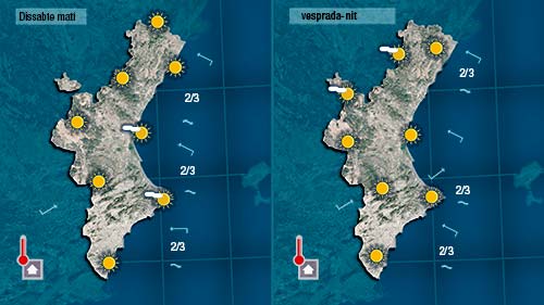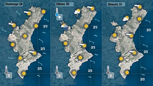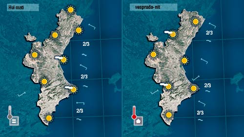 No descarte que hui tornen a pujar les temperatures a les hores centrals del dia en punts de l’interior i en zones pròximes a la costa del sud de València i del nord d’Alacant on el llebeig es deixarà sentir de vesprada.