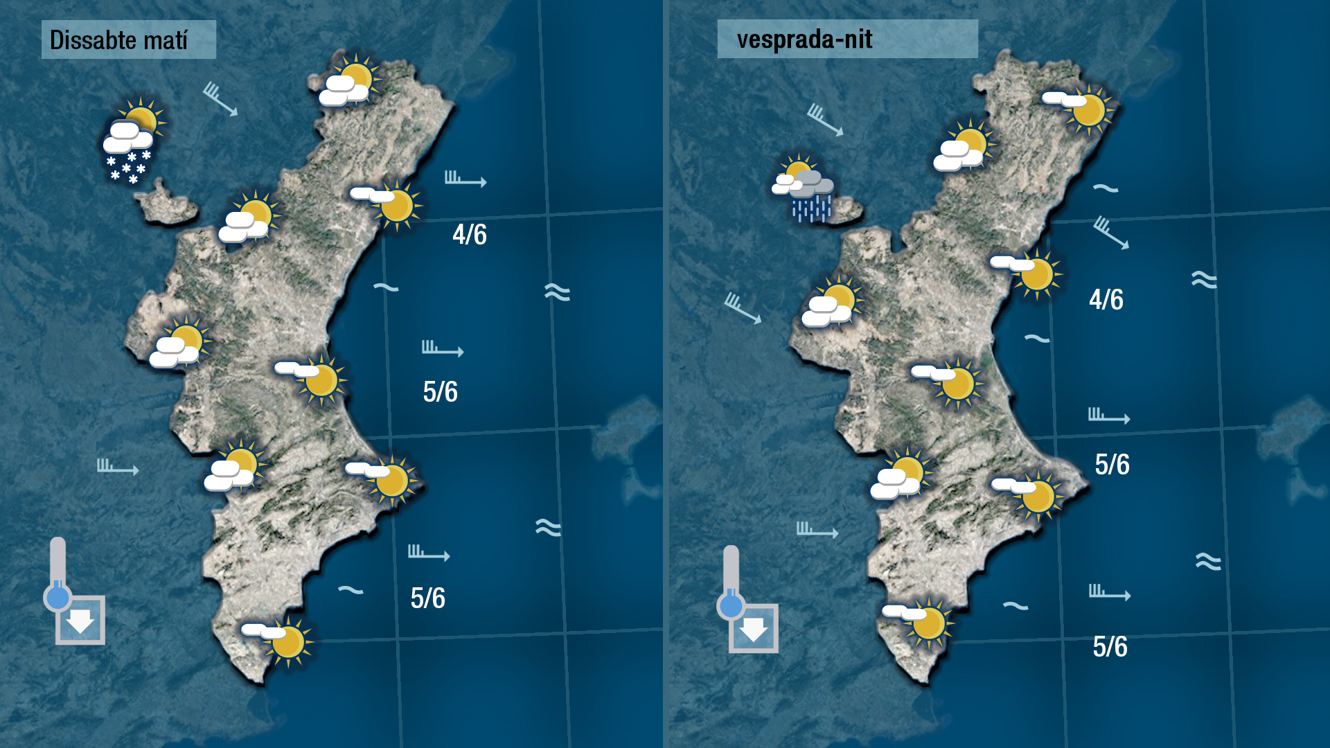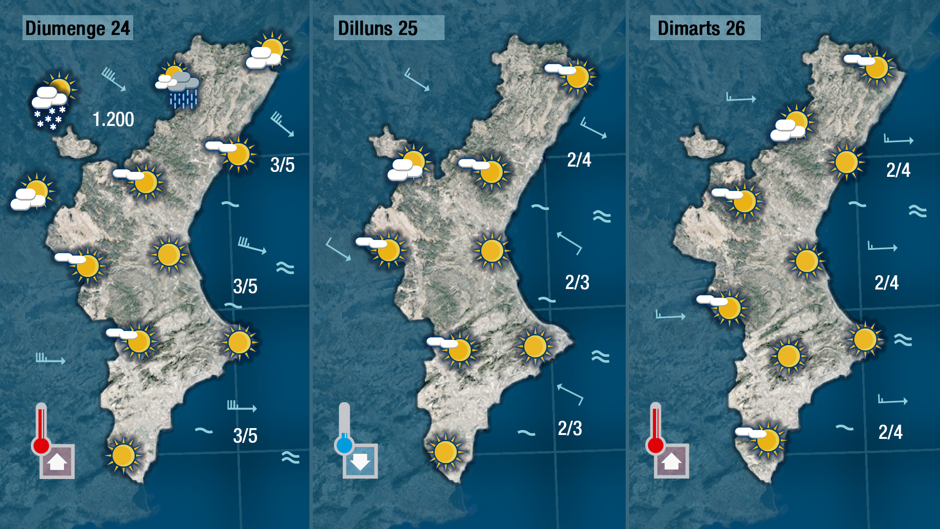 Diumenge afluixarà el vent i serà un poc més càlid. Les temperatures tocaran de nou els 20 graus a la costa. Al nord i per l’interiorpodrà registrar-se algun ruixat dèbil que seria en forma de neu entre els 1.200 i els 1.300 metres.