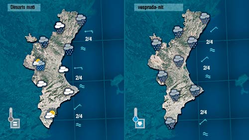 Els núvols i le sprecipitacions ens acompanyaran fins dimecres al migdia a la mitad sud de la Comunitat obrint-se calrs de vesprada per tot arreu.