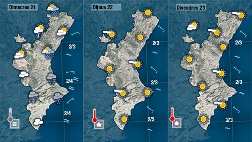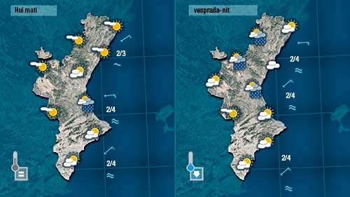 Hui tindrem més núvols al cel. No descartem algun ruixat de matí a la costa i de vesprada per l’interior. El vent de llevant acabarà bufant moderat a bona part de la Comunitat (sempre amb més força en punts de la costa) i les temperatures baixaran de forma notable.