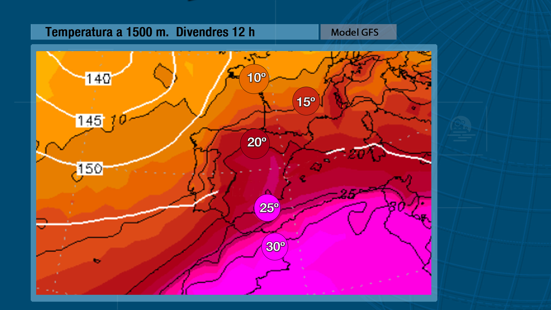 A les capes mitjanes i baixes de l’atmosfera (a 1.500 metres d’altura) identifiquem la massa d’aire càlida que ens farà patir bona cosa de calr els primers dies de juliol, amb l’isoterma de 25 graus afectant demà divendres tot l’interior de la Comunitat Valenciana.