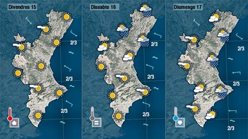 Demà dijous el mestral encara es deixarà sentir amb força al nord fins entrada la vesprada . Al centre i al sud encara que el vent dominant siga el xaloc (sud-est) també pujaran les temperatures diürnes.