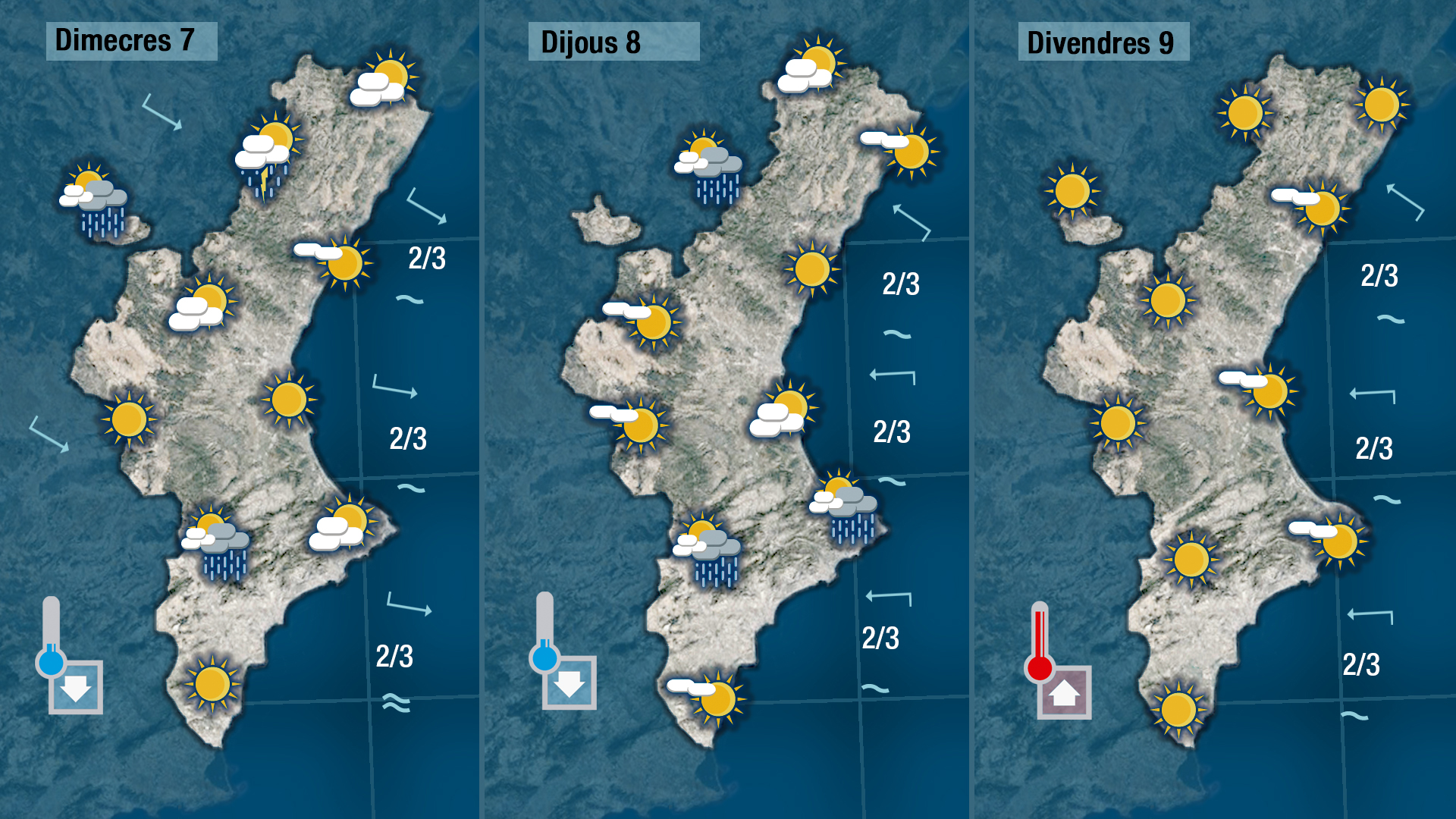 Dimecres les temperatures marcaran valor més normals, més suportables, i fins i tot cal esperar algun ruixat de vesprada i a poqueta nit a les zones de muntanya del nord i l’interior.