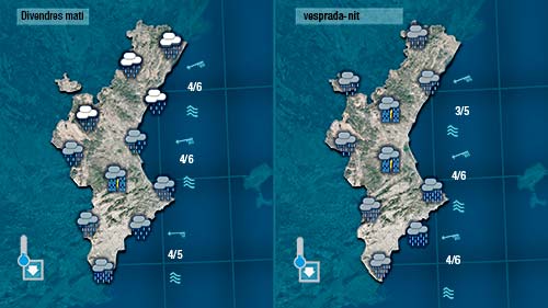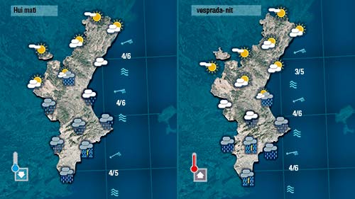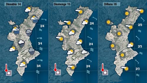 Dissabte ja podem dir que serà l’ultim dia d l’episodi. La primera part del dia encara cal esperar que els cel estiga prou carregat de núvols i les precipitacions encara podran ser generals però de cara a la vesprada notarem com els núvols es trequen i apoc apoc s’imposa el sol.