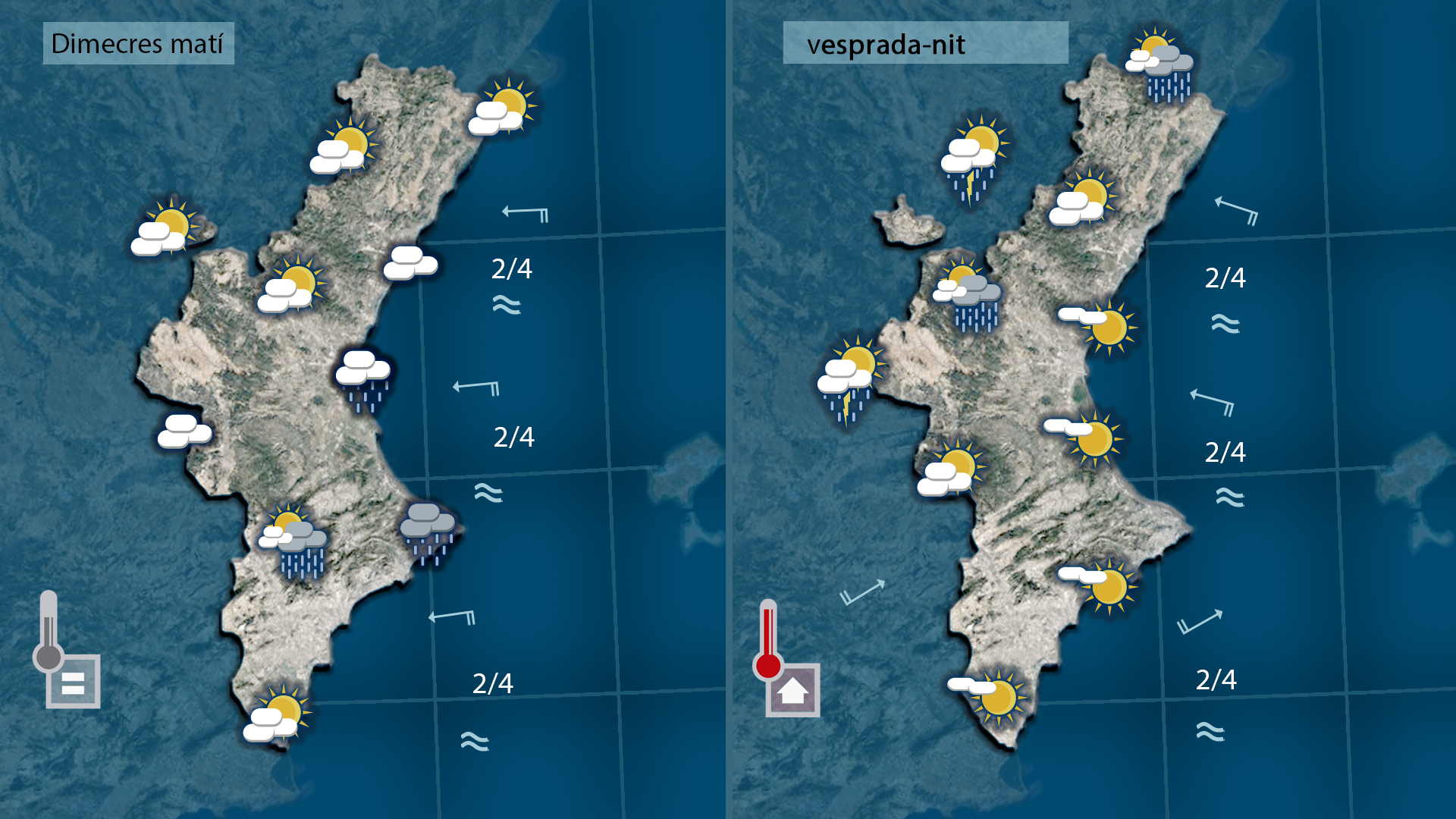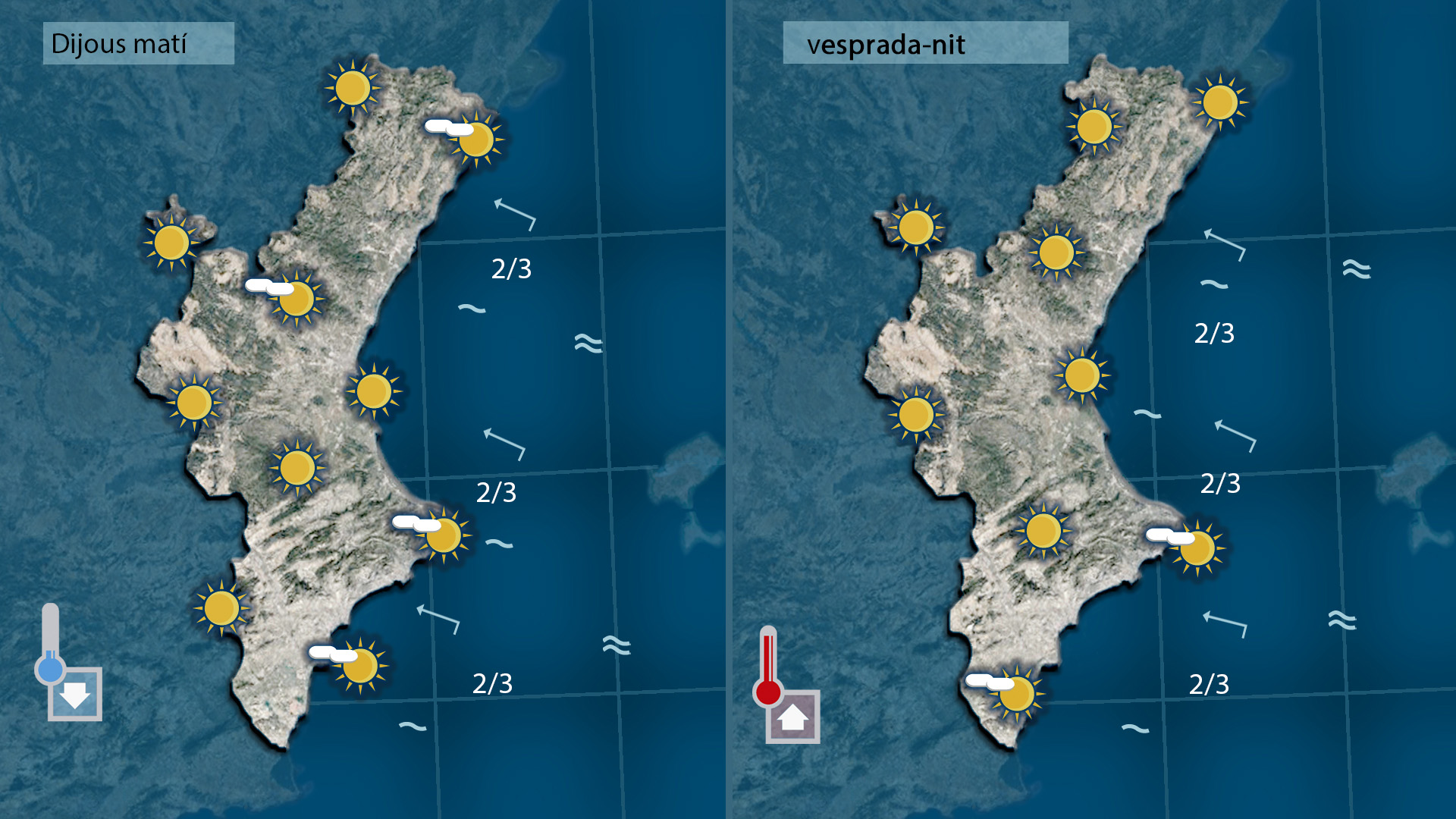 Divenfdres farà fins i tot calor a migdia a,mb la col·laboració del ponent però la nit de la plamntà patirà l’amenaça del vent que bufarà amb força de mestral deixant l’ambient més fresc però doumemge encalmarà i pujaran les temperatures